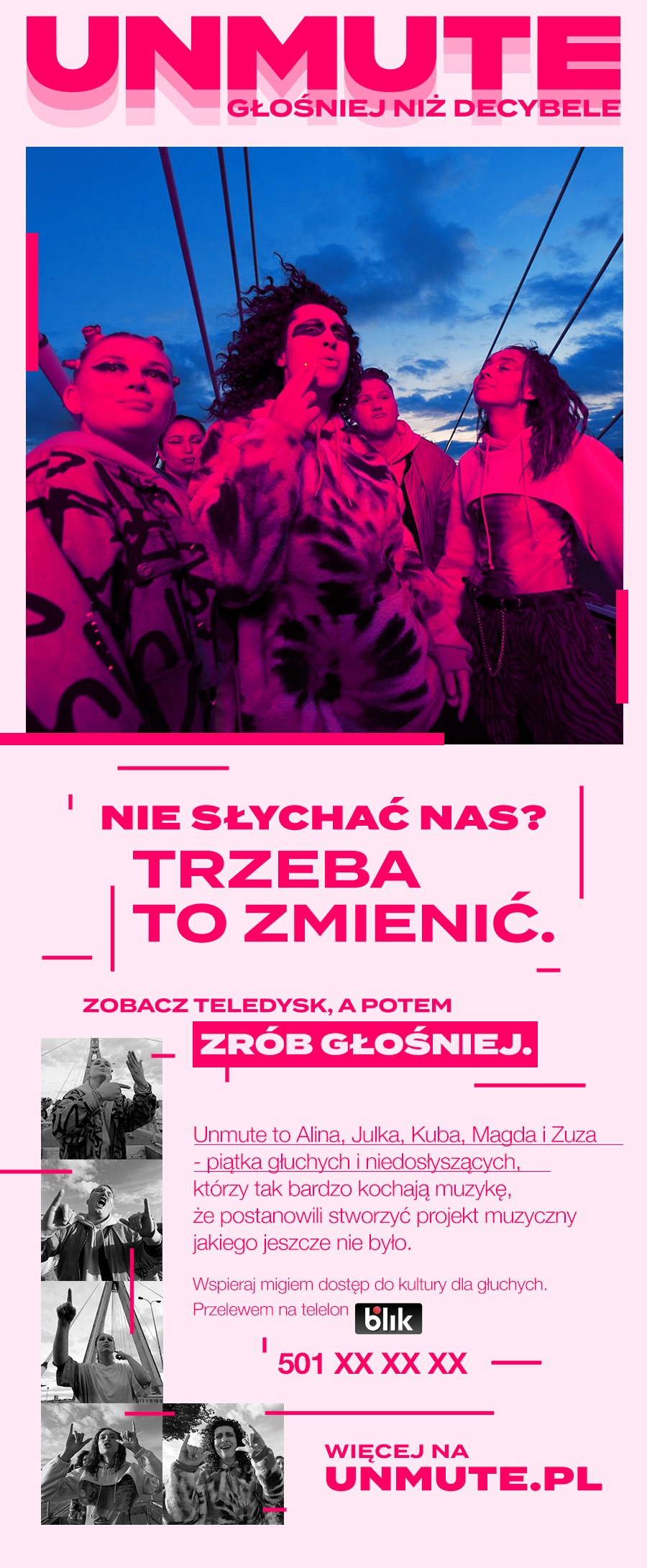 UNMUTE to absolutnie wyjątkowe przedsięwzięcie i pokaz skuteczności komunikacji marketingowej w dyskursie społecznym. To zrealizowany z polotem brawurowy pomysł na zwrócenie uwagi szerokiej opinii publicznej na problem społecznego wykluczenia Głuchych. To też przykład wykorzystania talentu i doświadczenia środowiska reklamowego do efektywnego „wyciągnięcia” trudnego tematu na pierwszy plan i sprawienia, że przekaz dotarł do milinów Polaków.