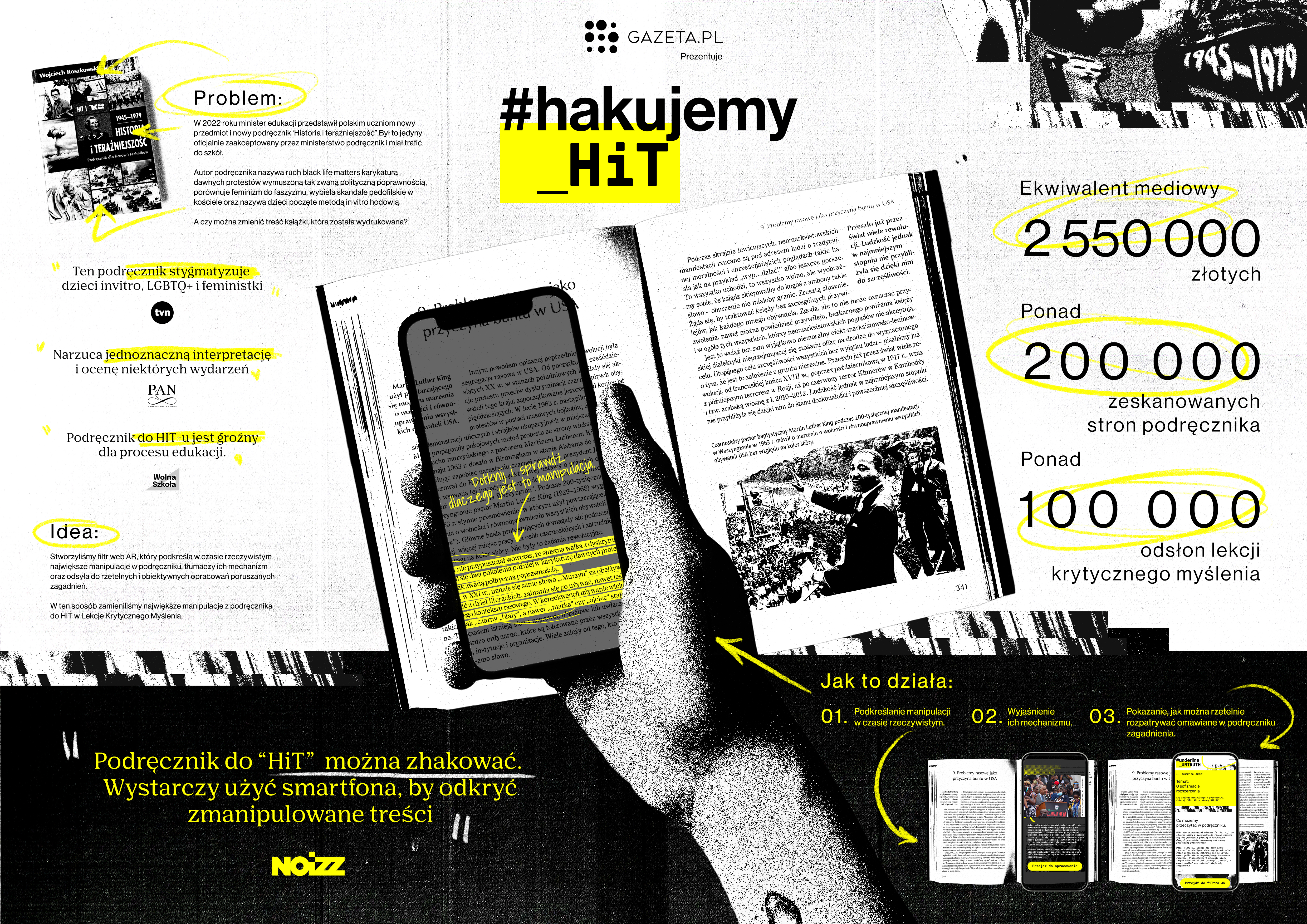 We wrześniu 2022 do szkół trafił nowy przedmiot „Historia i Teraźniejszość” i nowy kontrowersyjny podręcznik autorstwa prof. Roszkowskiego. W akcji #hakujemy_HiT wykorzystaliśmy nowe technologie takie jak filtr WEBAR, aby zamienić ten najbardziej zmanipulowany podręcznik, w podręcznik do nauki krytycznego myślenia.