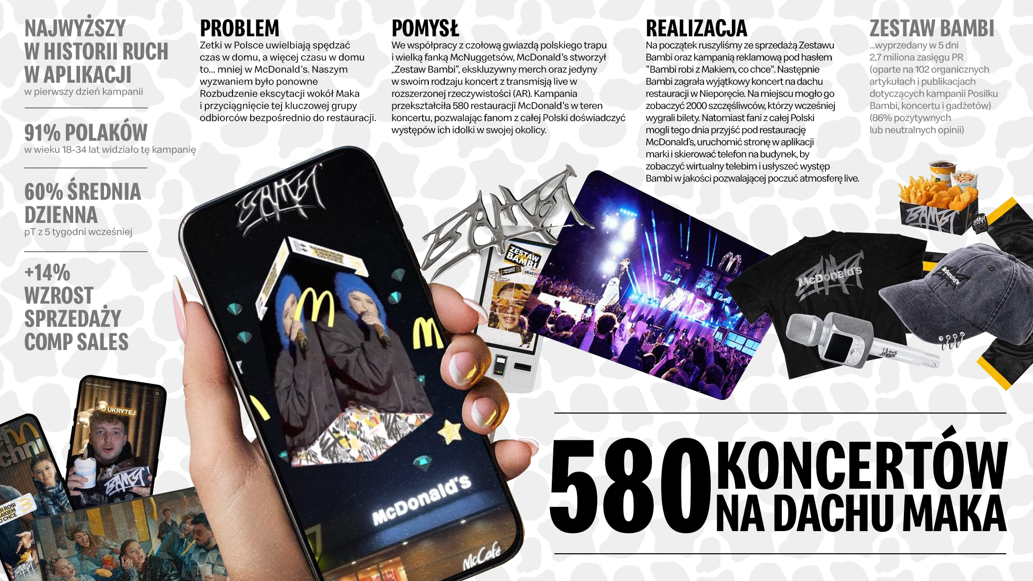 Zamiast kupować nośniki, zamieniliśmy każdy z 580 McDonald’s w Polsce w wirtualny ekran. Po zeskanowaniu złotych łuków aplikacja nakładała transmisję live z koncertu Bambi na dach lokalnej restauracji. Sieć lokali stała się rozproszonym DOOH-em, którego nikt nie mógł pominąć, a Zestaw Bambi wyprzedano w 6 dni.