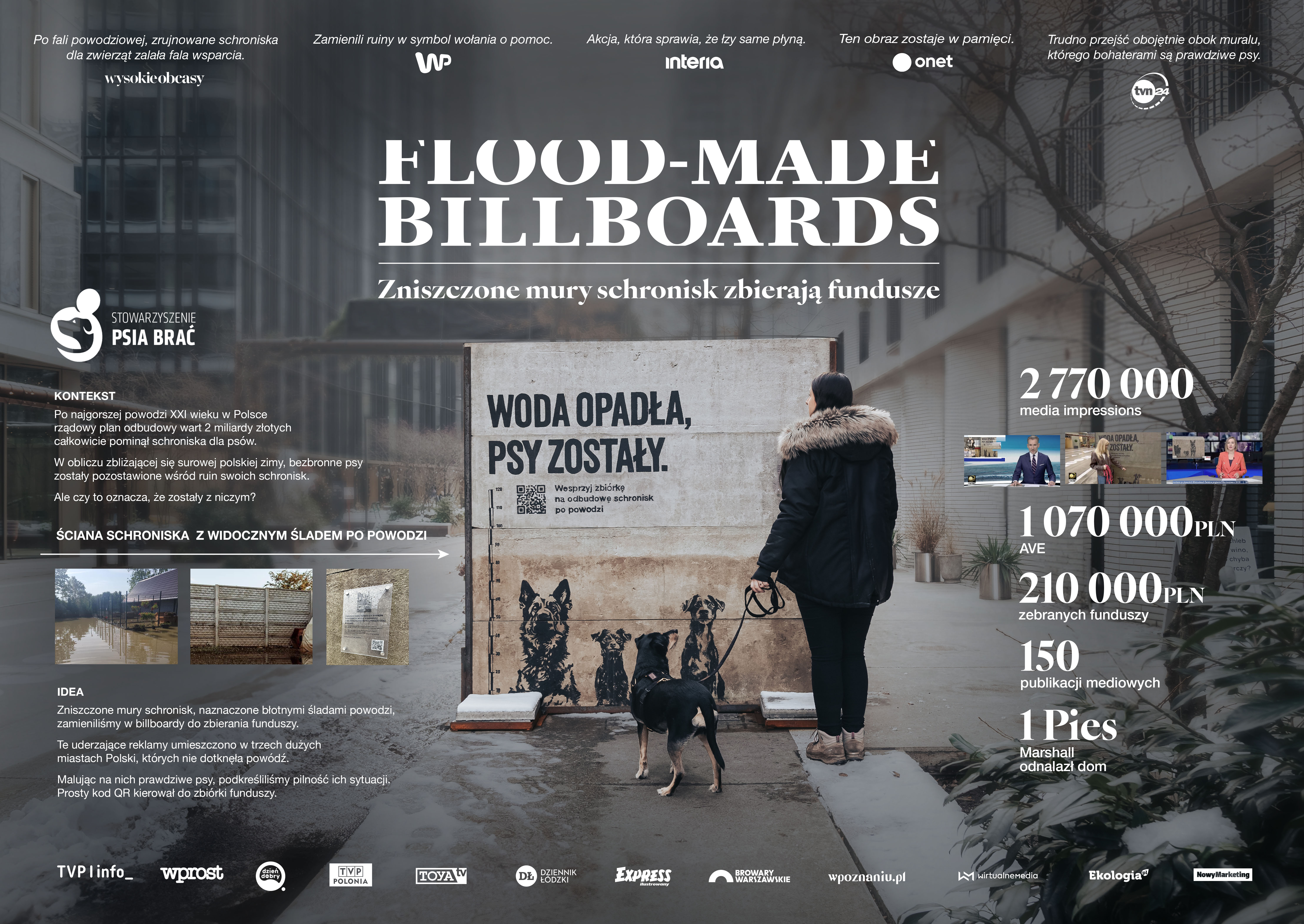 Największa powódź w XXI wieku dotknęła również schroniska dla zwierząt. By je odbudować powstała Kampania Flood-Made Billboards zmieniając zniszczone przez powódź ściany schronisk w emocjonalne instalacje. Billboardy z portretami psów przyciągnęły uwagę mediów i darczyńców, zwiększyły świadomość problemu i zebrały 210 000 zł na odbudowę schronisk.