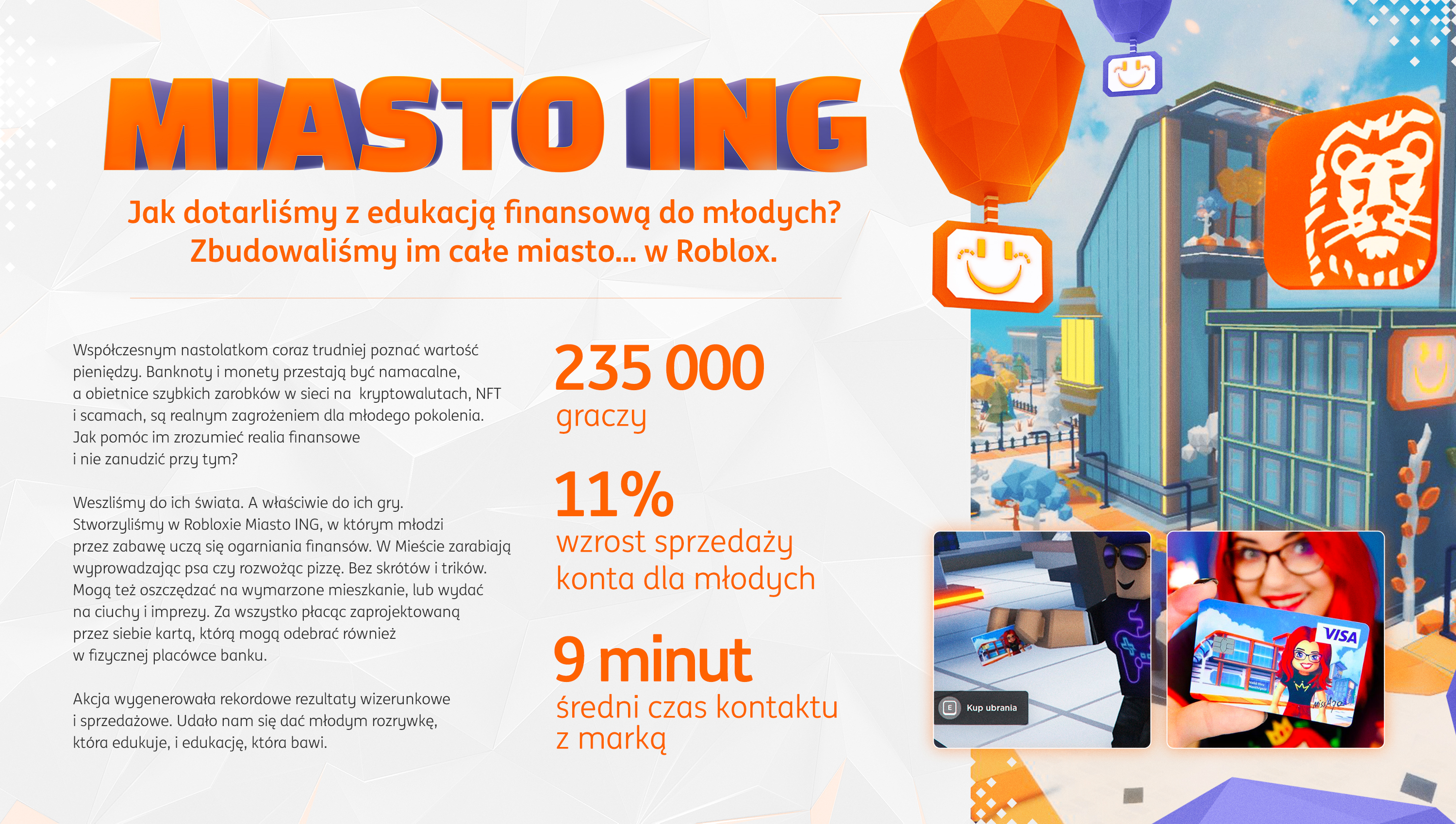Miasto ING powstało by pomóc Młodym wejść w finansową dorosłość ze znajomością zasad gry. W naturalnym środowisku serwera Roblox poznali życiowe zasady zarabiania i zarządzania pieniędzmi. Ale pozwoliliśmy graczom pozostać graczami. Mimo przyjęcia konkretnej porcji konkretnej wiedzy zadomowili się, polubili nas, zapamiętali i wybrali produkty ING.