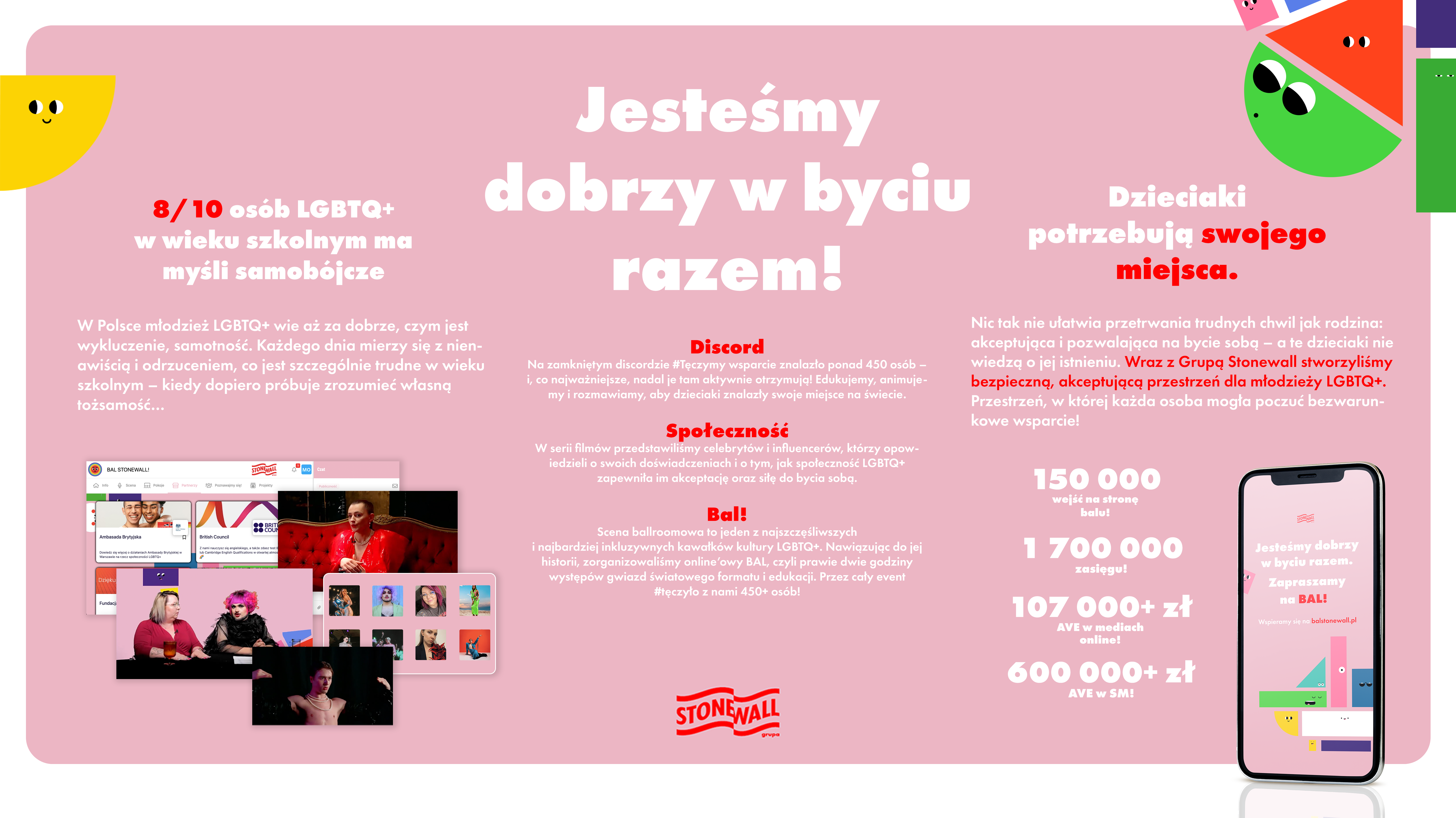 GrupaStonewall stanęła naprzeciw internetowej dyskryminacji i wykluczeniu młodzieży LGBTQ+. Stworzyliśmy dzieciakom dedykowany serwer na Discordzie, który umożliwiał nawiązanie nowych znajomości, swobodną wymianę myśli i wejściówkę na wirtualny queerowy BAL, pełen stoisk, gier, ze spektakularnym kluczem programu: występami gwiazd sceny ballroomowej