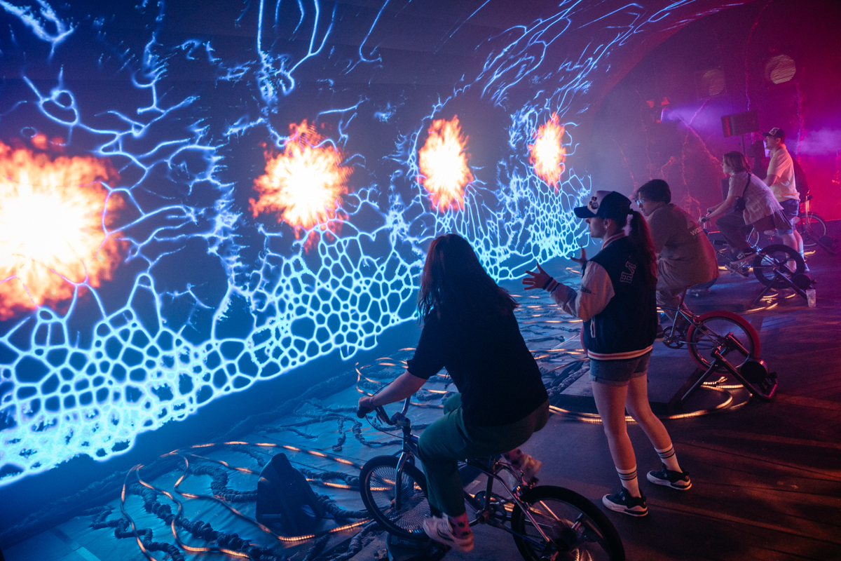 Strefa Stranger Things na OWF 2022 to interaktywne doświadczenie przejścia uczestników festiwalu w świat serialowej Drugiej Strony. Wizualizując systemy złożone połączone z sensorami (prędkość jazdy, siła podmuchu) daliśmy uczestnikom poczucie zanurzenia się w generowanym świecie, inspirowanym estetyką “Stranger Things”.