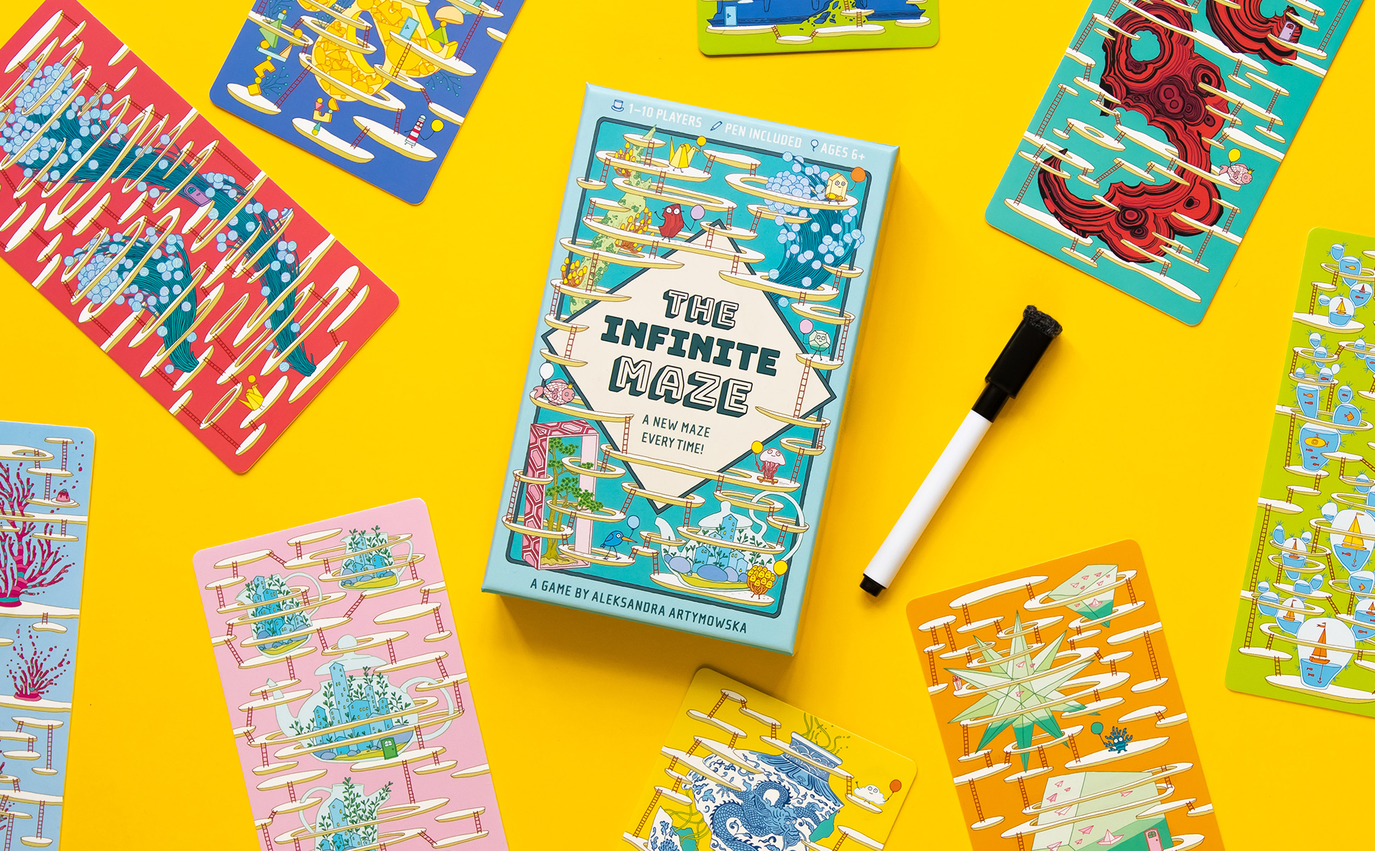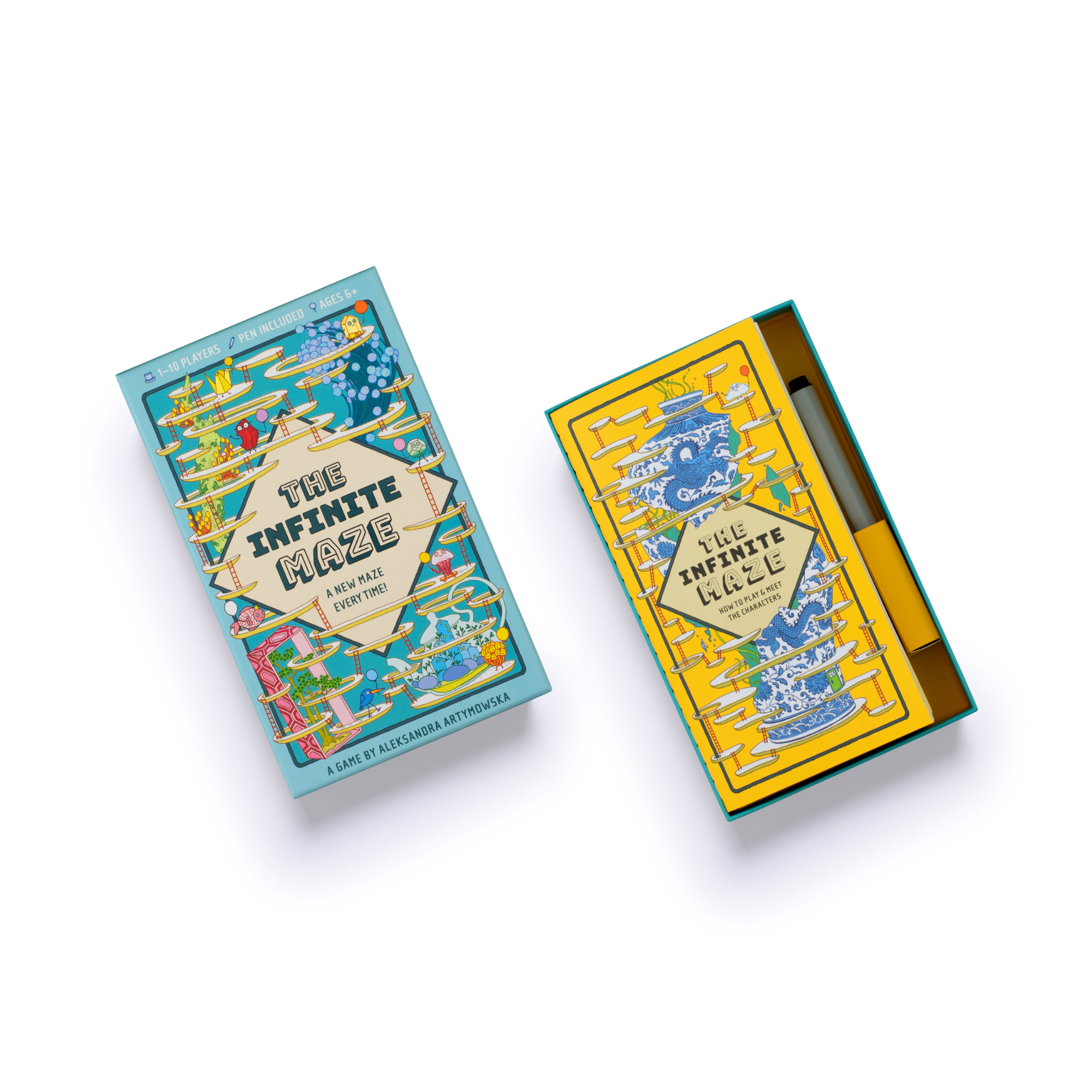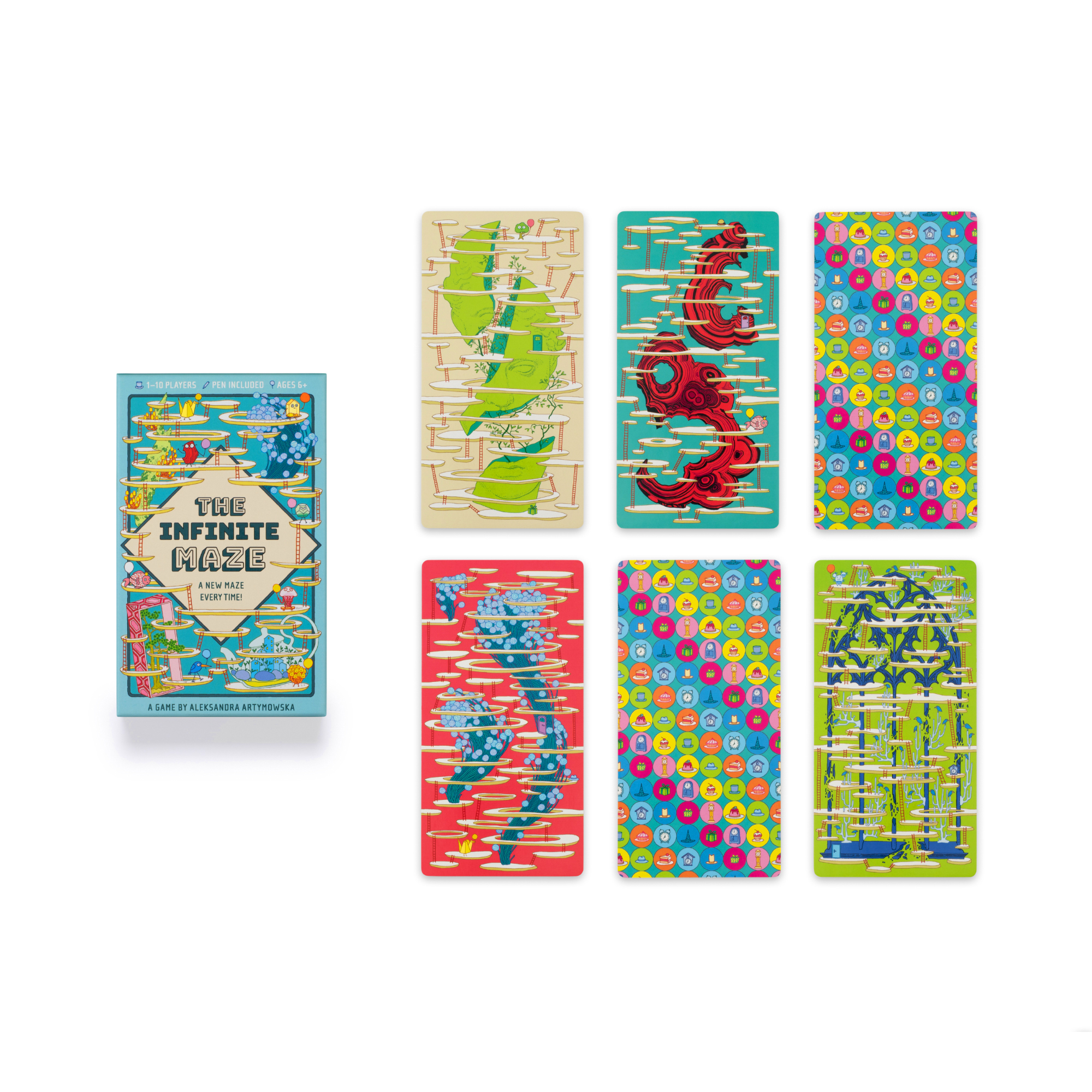 Gra INFINITE MAZE to 20 unikalnie zilustrowanych kart z labiryntami, które można ułożyć w dowolnej kolejności, w ponad dwóch trylionach różnych kombinacji, ale zawsze jest tylko 1 prawidłowe rozwiązanie. Każda karta przedstawia swój własny, niepowtarzalny świat. Gra składa się z 20 kart, ulotki z instrukcją, zmazywalnego flamastra oraz pudełka.