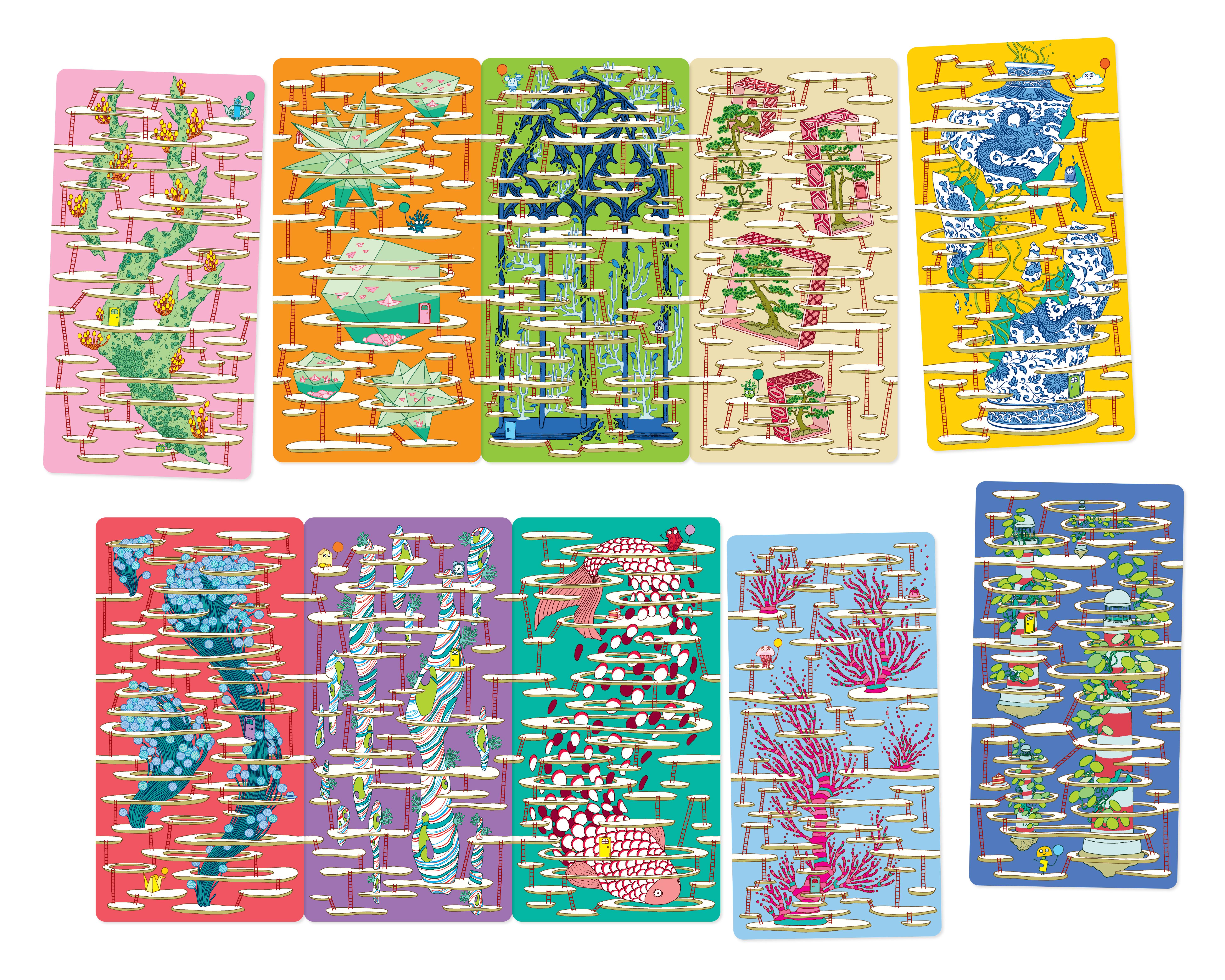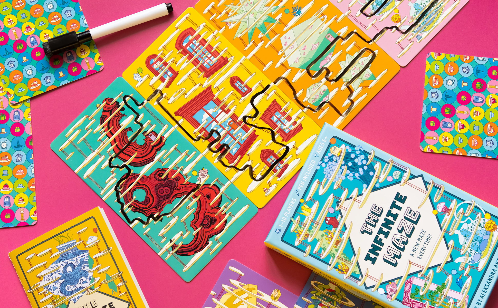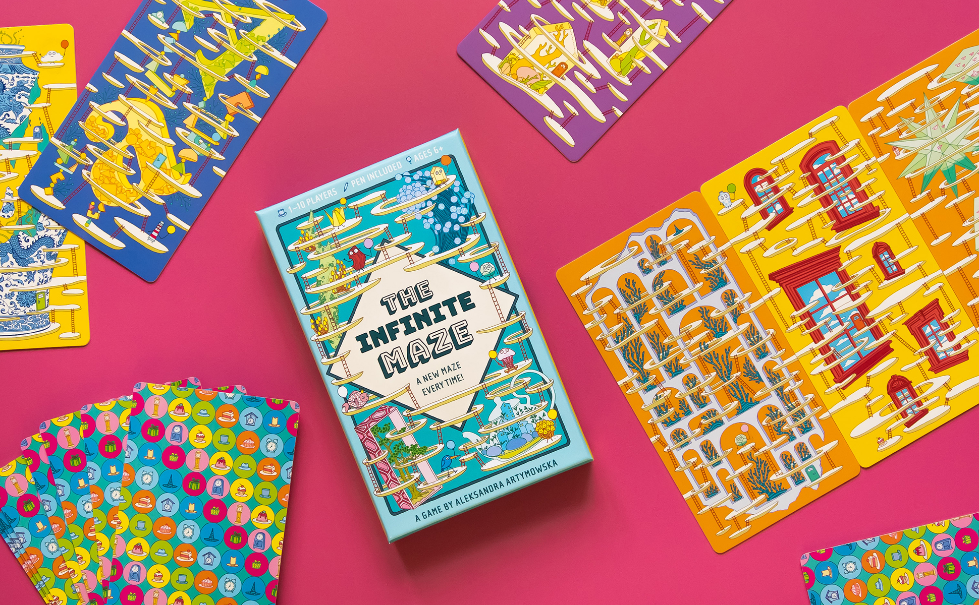 Gra INFINITE MAZE to 20 unikalnie zilustrowanych kart z labiryntami, które można ułożyć w dowolnej kolejności, w ponad dwóch trylionach różnych kombinacji, ale zawsze jest tylko 1 prawidłowe rozwiązanie. Każda karta przedstawia swój własny, niepowtarzalny świat. Gra składa się z 20 kart, ulotki z instrukcją, zmazywalnego flamastra oraz pudełka.