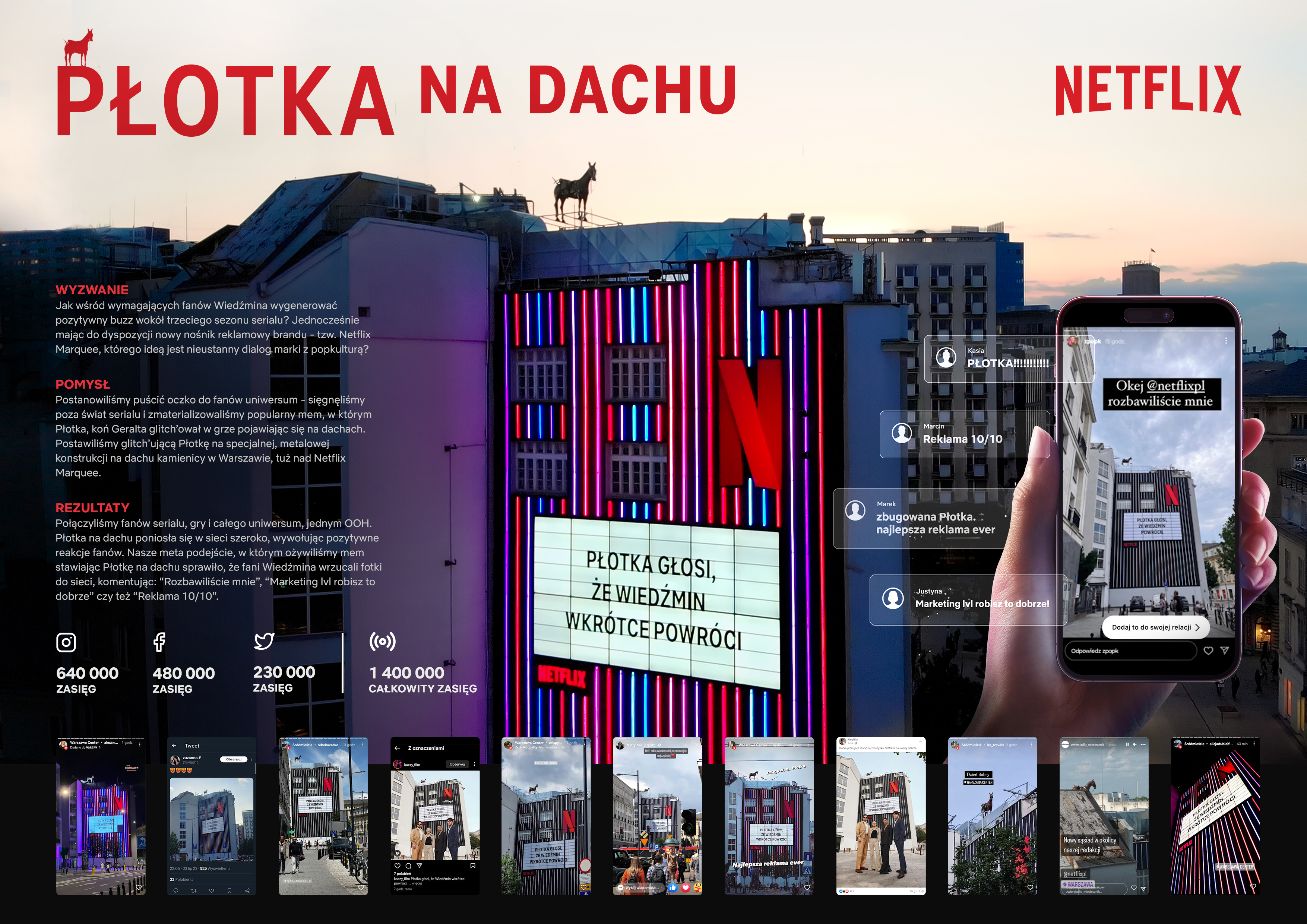 Jak poinformować o premierze trzeciego sezonu Wiedźmina i wygenerować pozytywny buzz? Puściliśmy oczko do fanów uniwersum i zmaterializowaliśmy popularny mem - glitchujący w grze koń Geralta trafił na dach kamienicy w Warszawie, obok "wiedźmińskiego" OOH. Płotka na dachu poniosła się w sieci szeroko, wywołując pozytywne reakcje fanów.