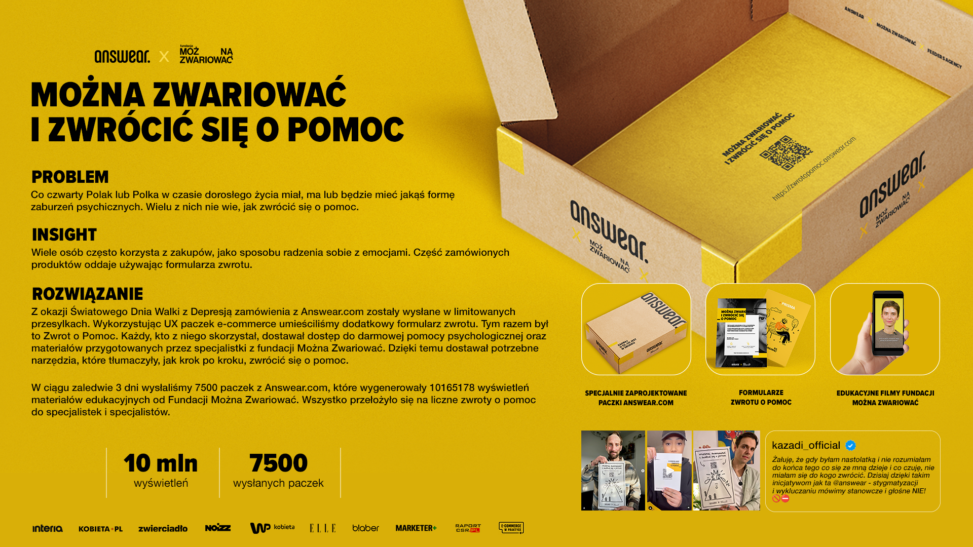 W Dzień Walki z Depresją Answear i Można Zwariować zmienili UX przesyłek umieszczając dodatkowy formularz zwrotu. Był to „Zwrot o Pomoc”. W ciągu zaledwie 3 dni 7500 paczek zamieniło się w 10 mln wyświetleń materiałów edukacyjnych od Można Zwariować oraz dało dostęp do darmowej pomocy psychologicznej, która przełożyła się na liczne zwroty o pomocy.