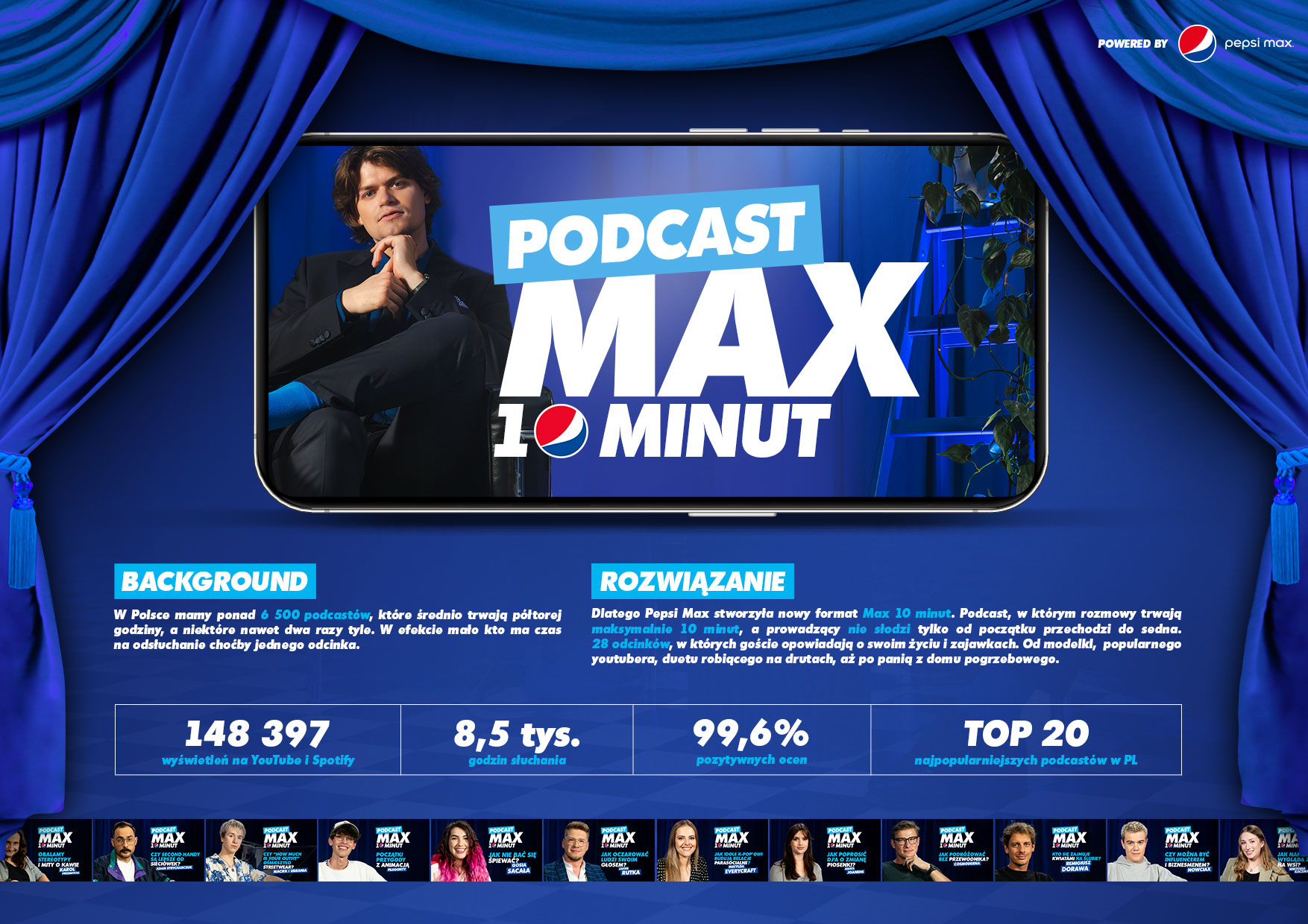 Stworzyliśmy najkrótszy podcast ever "MAX10MINUT", przy którym słuchacze spędzili łącznie ponad 8500 godzin, a 99.6% z nich oceniło go pozytywnie. Rozwiązując problem słuchaczy, stał się jednym z najbardziej popularnych podcastów w Polsce, promując przy tym Pepsi Max.