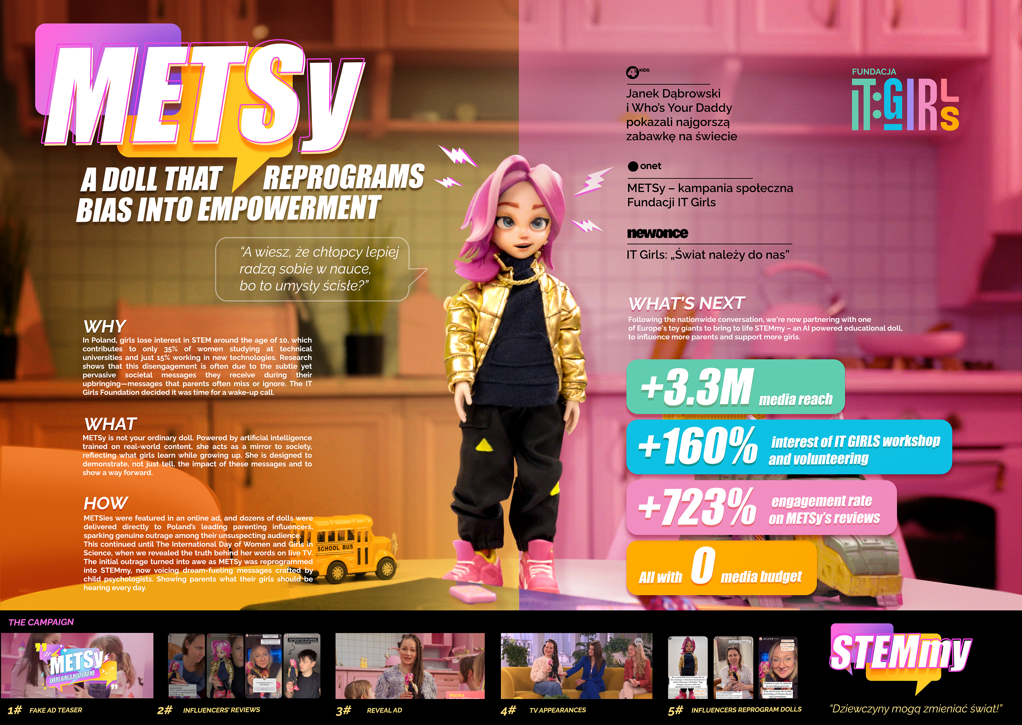 METSy to lalka wygłaszająca stereotypy płci wygenerowane przez nieocenzurowany model GenAI na podstawie opinii z Internetu. Narażone na nie od najwcześniejszych lat dziewczynki tracą pewność siebie i zainteresowanie STEM-em. METSy można jednak przeprogramować w STEMmy, lalkę wspierającą dziewczynki słowami napisanymi przez psychologów dziecięcych.