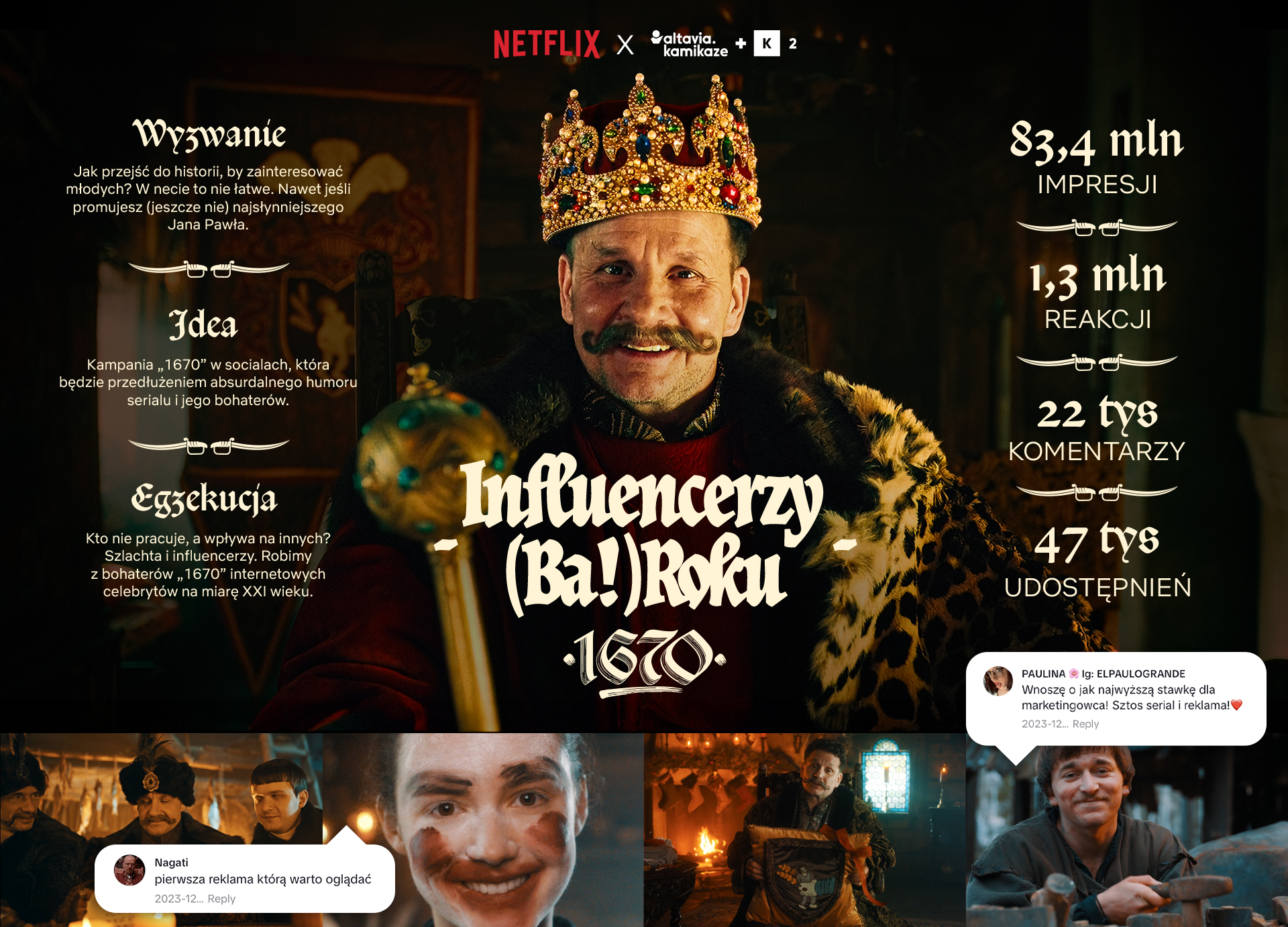 Przeprowadzona w 100% w social mediach kampania promocyjna serialu Netflix “1670” to połączenie pozornie sprzecznych obserwacji z odważnym pomysłem, który osadza świat XVII-wiecznej szlachty w kontekście aktualnych trendów. Social media stają się naturalnym przedłużeniem produkcji, która pokazuje, że historia jest bardziej aktualna niż sądzimy.