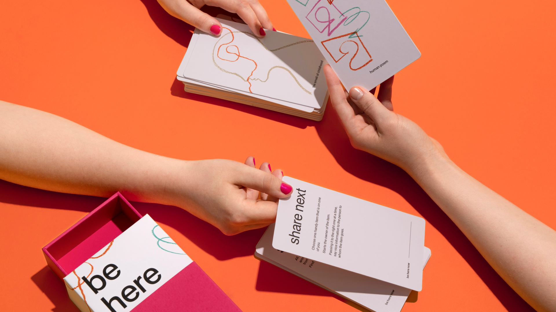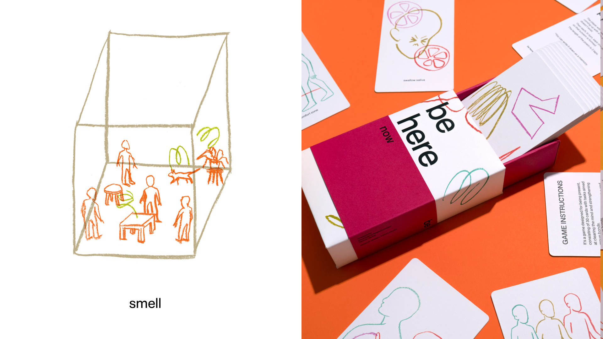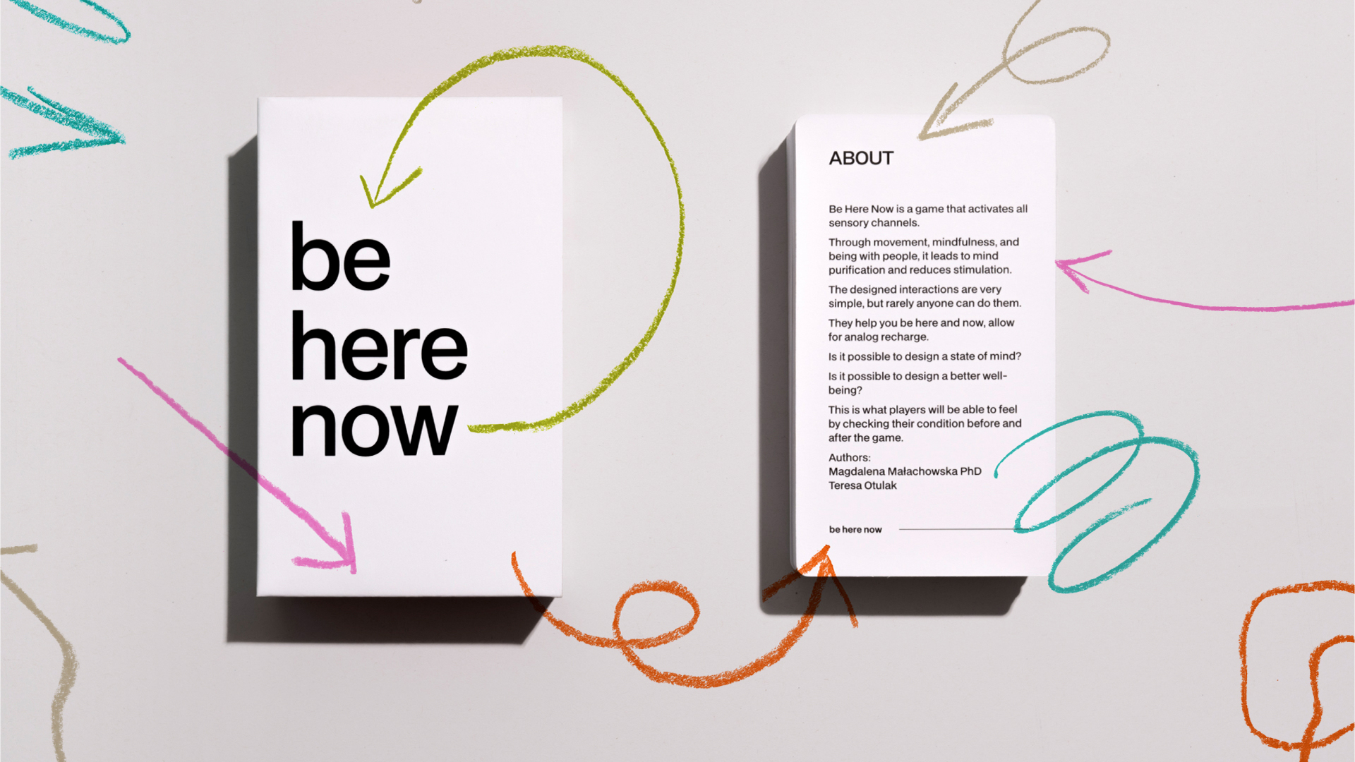 Be Here Now stworzono poprzez badania z zakresu zrównoważonego designu i EEE (electrical and electronic equipment). Zainspirowana elektrycznością w naszym życiu powstała gra, będąca zestawem prostych zadań, które zachęcają ludzi do wzajemnej interakcji. Częścią projektu była wystawa “Unplugged” mające zaznajomić ludzi z EEE i designem cyrkularnym.