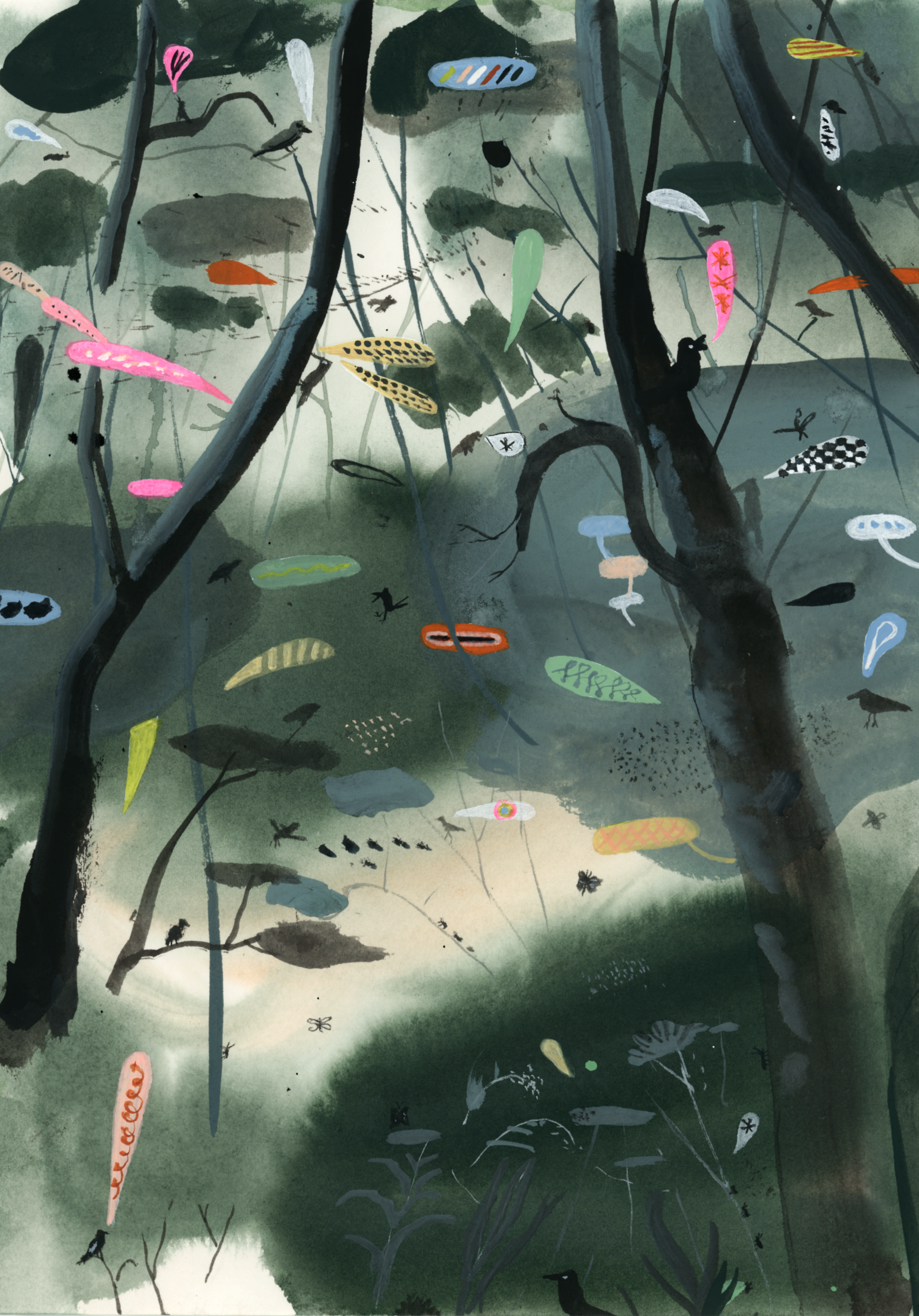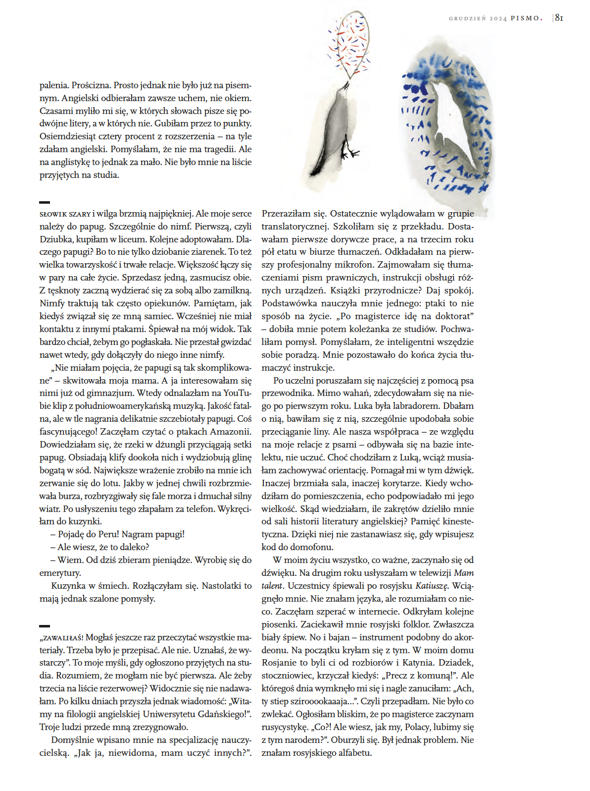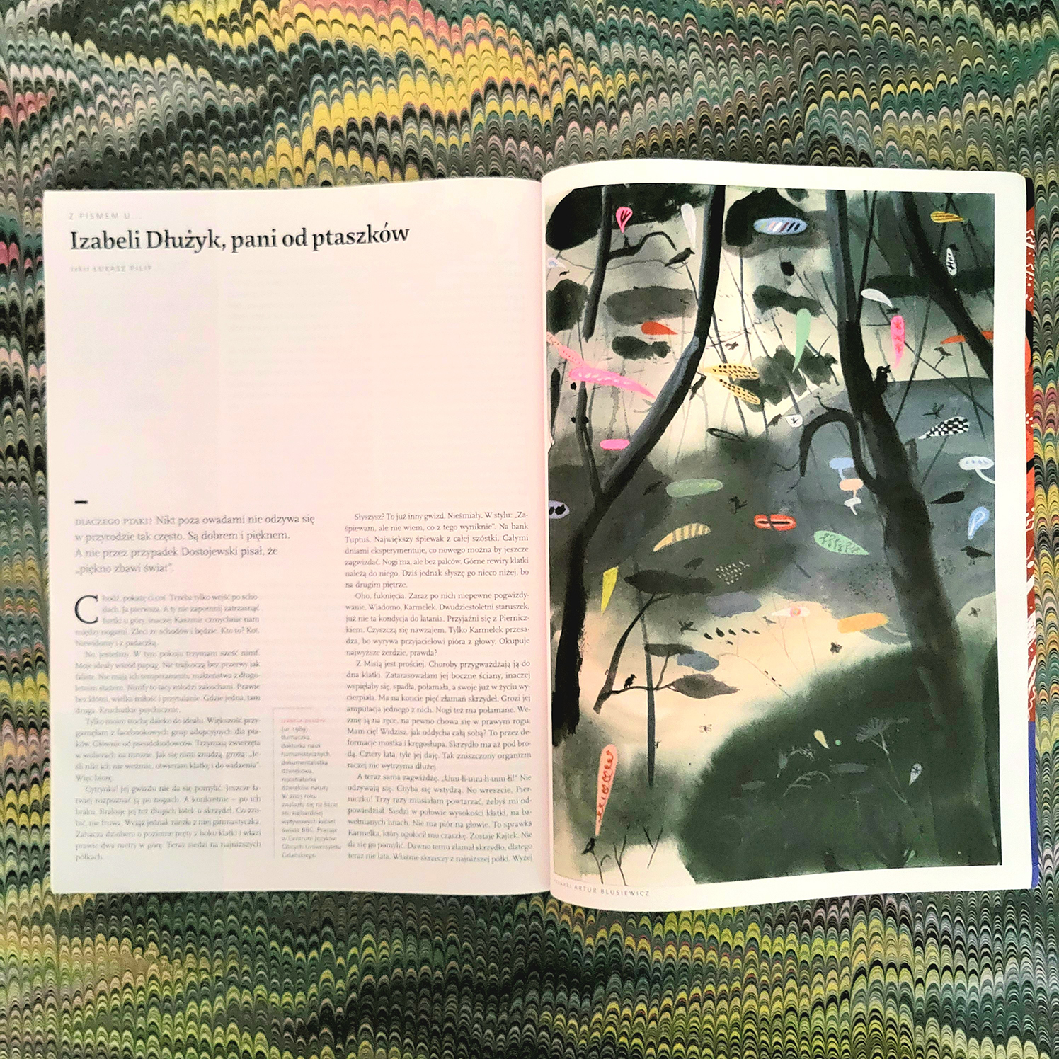 Niezwykła bohaterka reportażu, osoba niewidoma, rozpoznaje ptaki nie dzięki wzrokowi, lecz poprzez ich śpiew, trzepot skrzydeł i inne dźwięki. Ilustracje nawiązują do tej wyjątkowej umiejętności, starając się uchwycić świat dźwięków w formie obrazu, oddając wrażenie harmonii natury, którą Izabela odbiera w sposób unikalny i niezwykle wrażliwy.