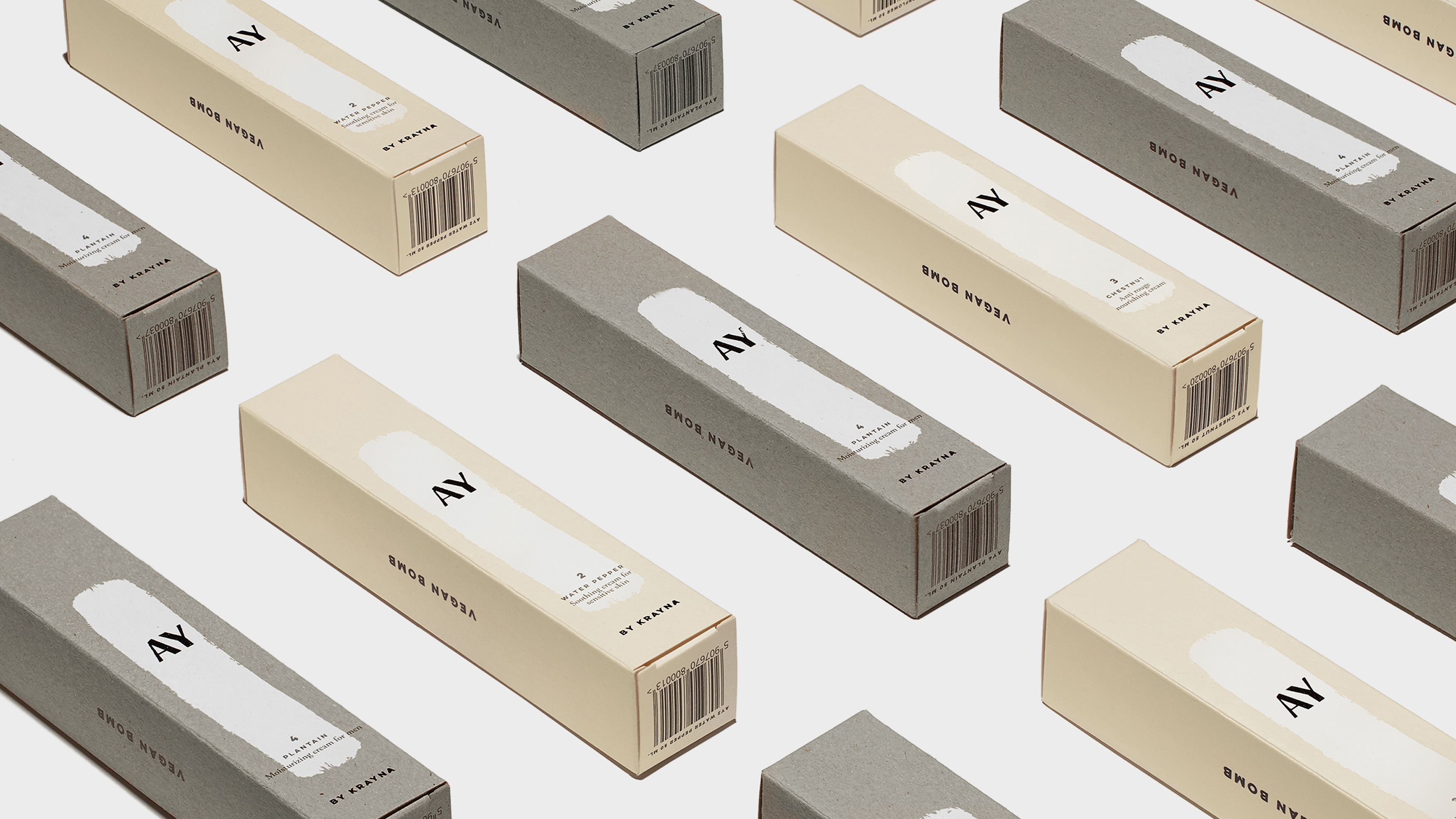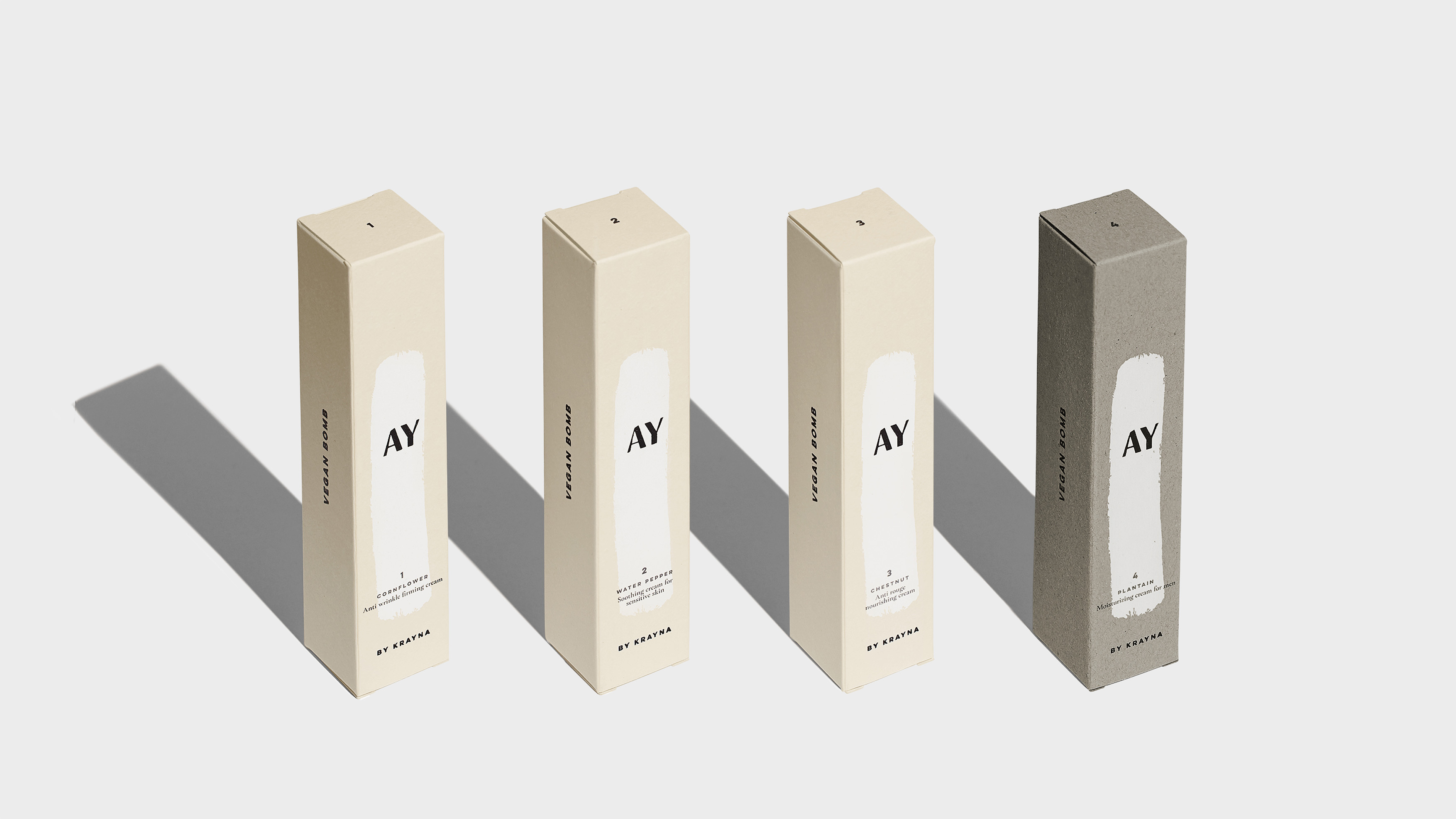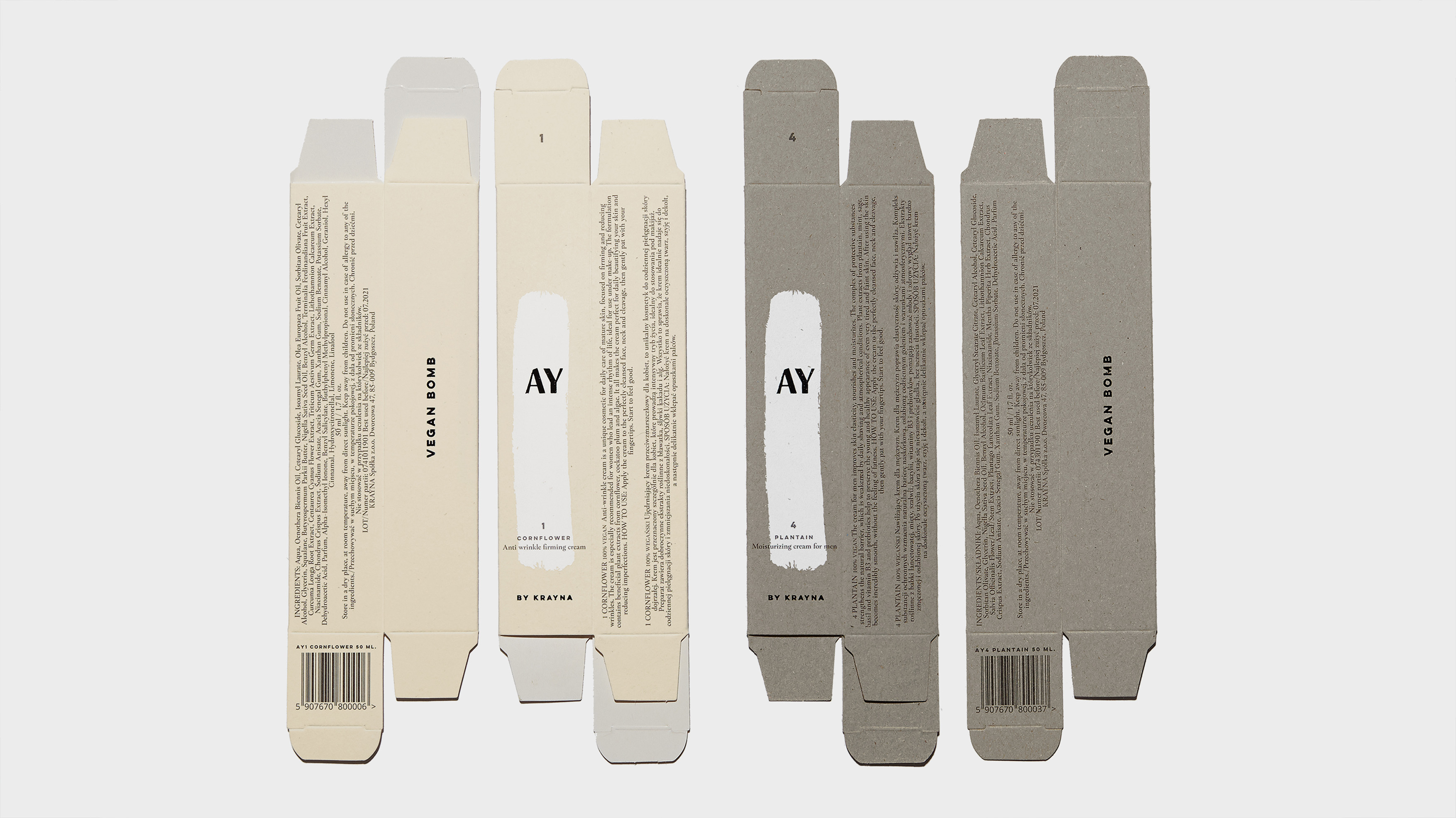 KRAYNA to młody polski brand kosmetyczny wprowadzający na rynek swój pierwszy produkt: AY - autorską kolekcję 4 wegańskich kremów. Ideą marki jest przejrzystość, otwartość, lokalność oraz dbałość o naturę. Kierując się tymi wartościami, stworzyliśmy opakowania oddające czystość i naturalność produktów, osiągając również pożądany komunikat unisex.