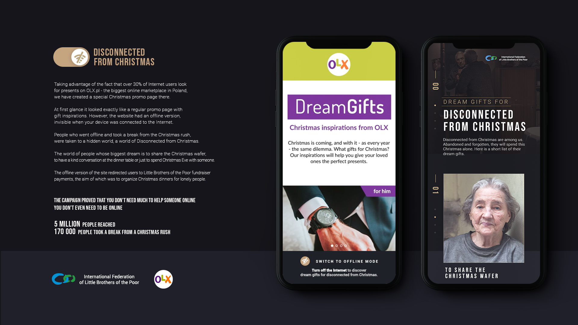 Klasyczna wydawałoby się podstrona z upominkowymi inspiracjami w serwisie OLX miała swoją ukrytą offlinową wersję. Wyłączając Internet i odcinając się od świątecznej gorączki trafiało się do ukrytego świata odciętych od Świąt – ludzi starszych i samotnych. To dla nich stowarzyszenie mali bracia Ubogich organizuje wspólne kolacje wigilijne.