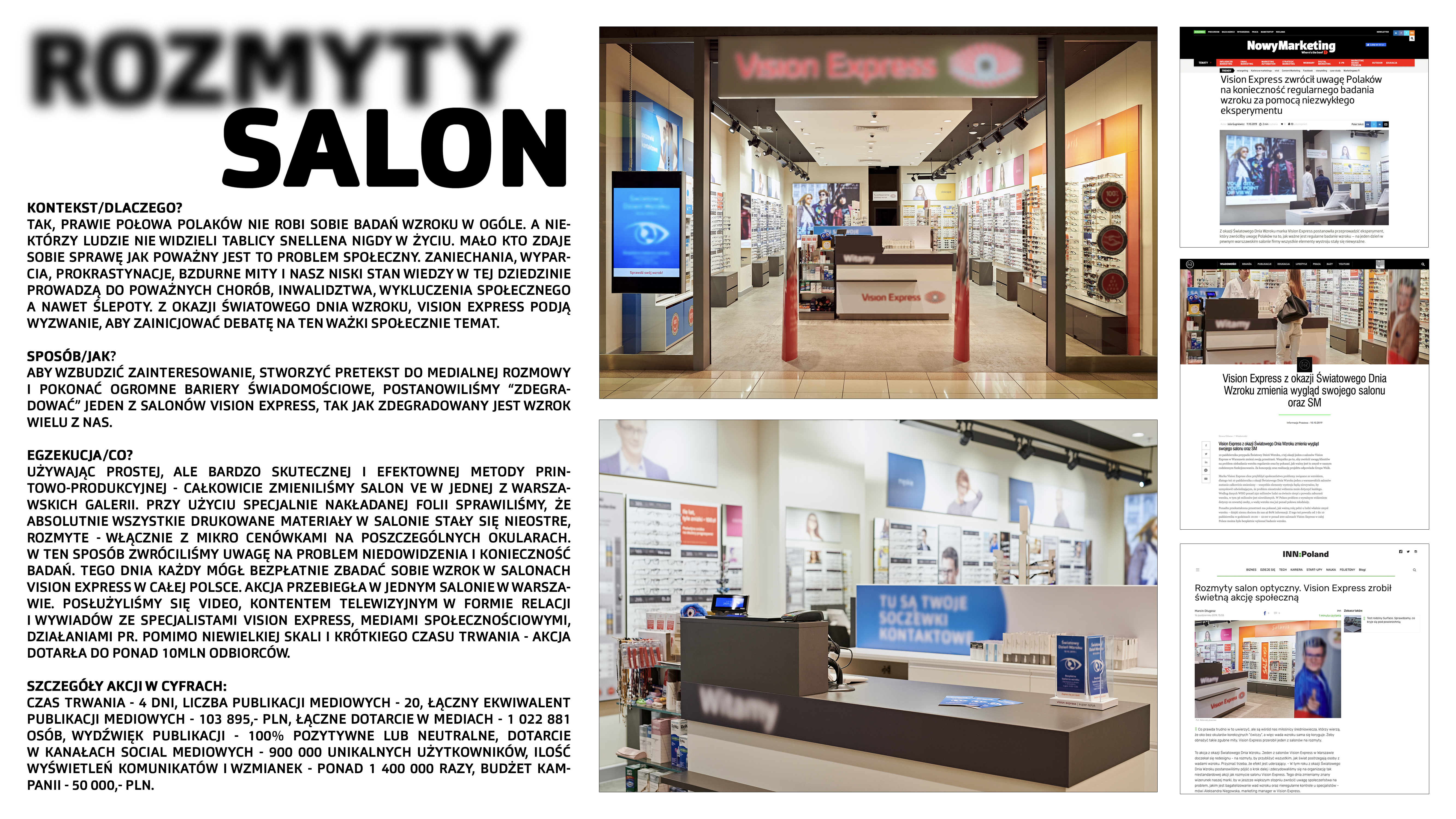 Prawie połowa Polaków nie bada wzroku regularnie. To poważny problem społeczny. Z okazji Światowego Dnia Wzroku, VE zainicjował debatę na ten ważki temat. Aby wzbudzić zainteresowanie "zdegradowaliśmy" salon VE. Wszystkie drukowane materiały w salonie stały się nieostre. Tego dnia każdy mógł bezpłatnie zbadać wzrok w salonach VE w całej Polsce.