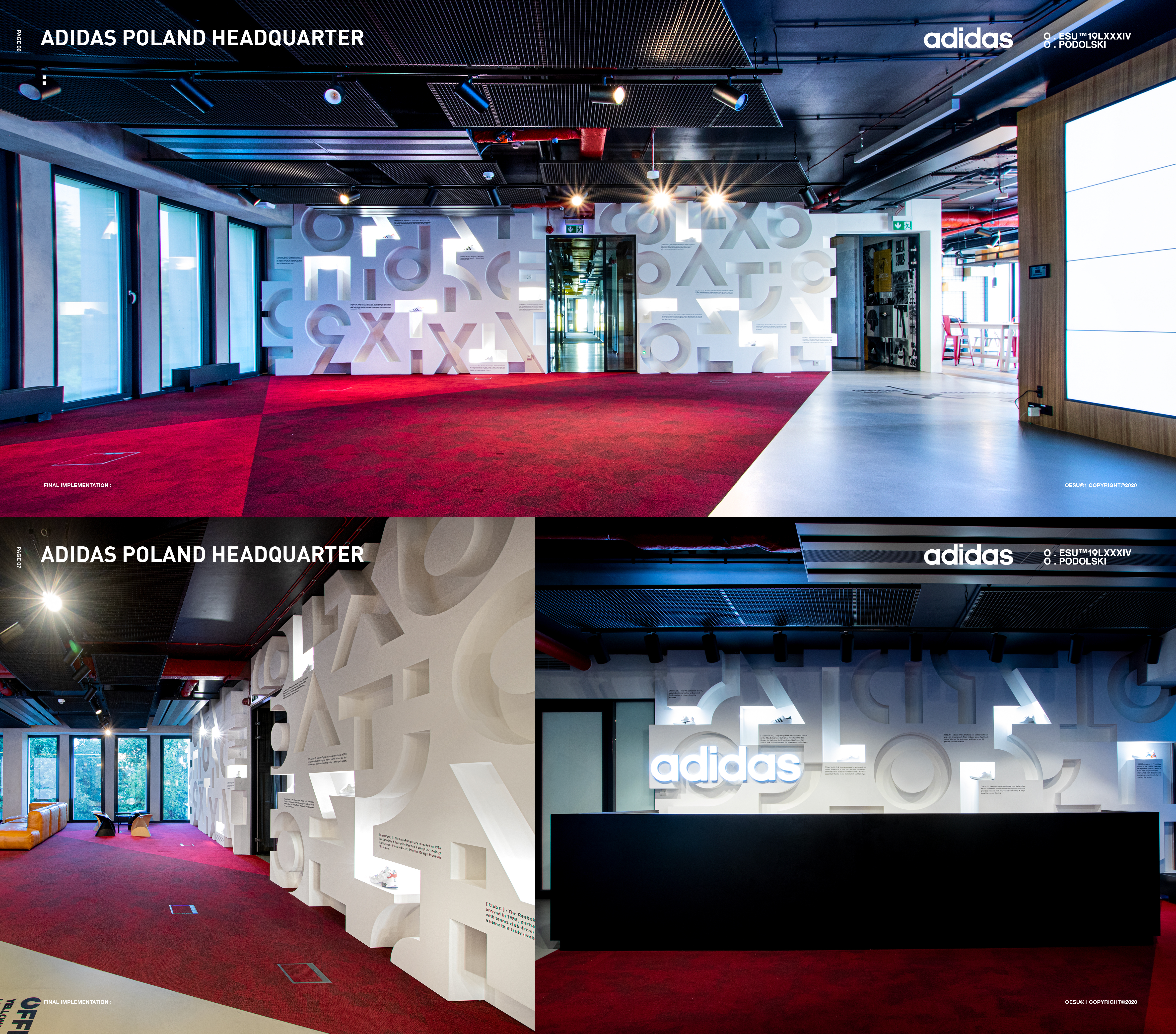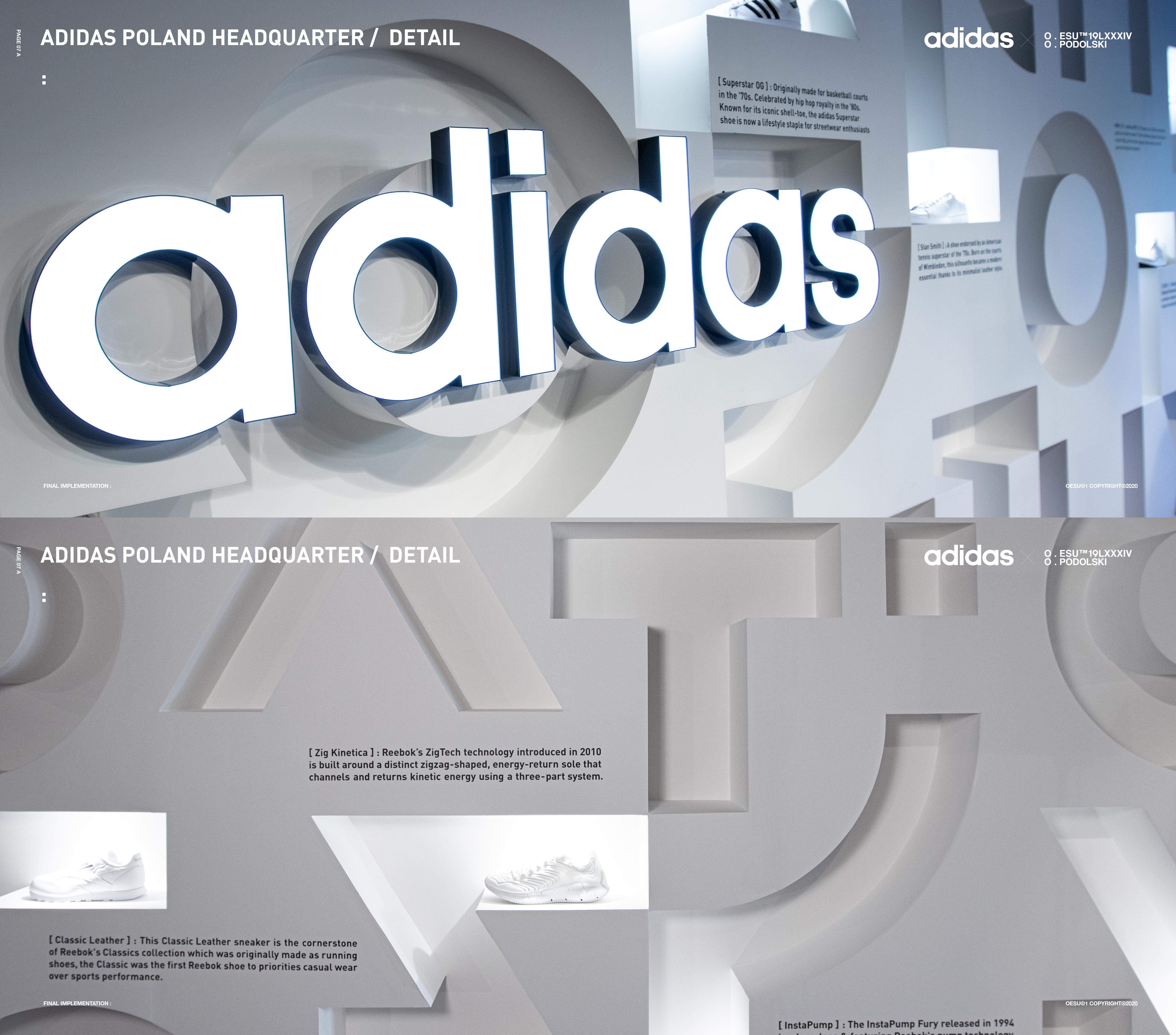 ADIDAS POLAND [ SIEDZIBA GŁÓWNA ] : Instalacja przestrzenna w części recepcyjnej polegająca na zbudowaniu 3 scian 3D. Funkcja Instalacji to estetyka samego lobby plus funkcjonalność polegająca na pokazaniu wybranych modeli butów na dany sezon. [ co sezon zmiana modeli ] Storzona została zgodnie z GuideLinem Marki.