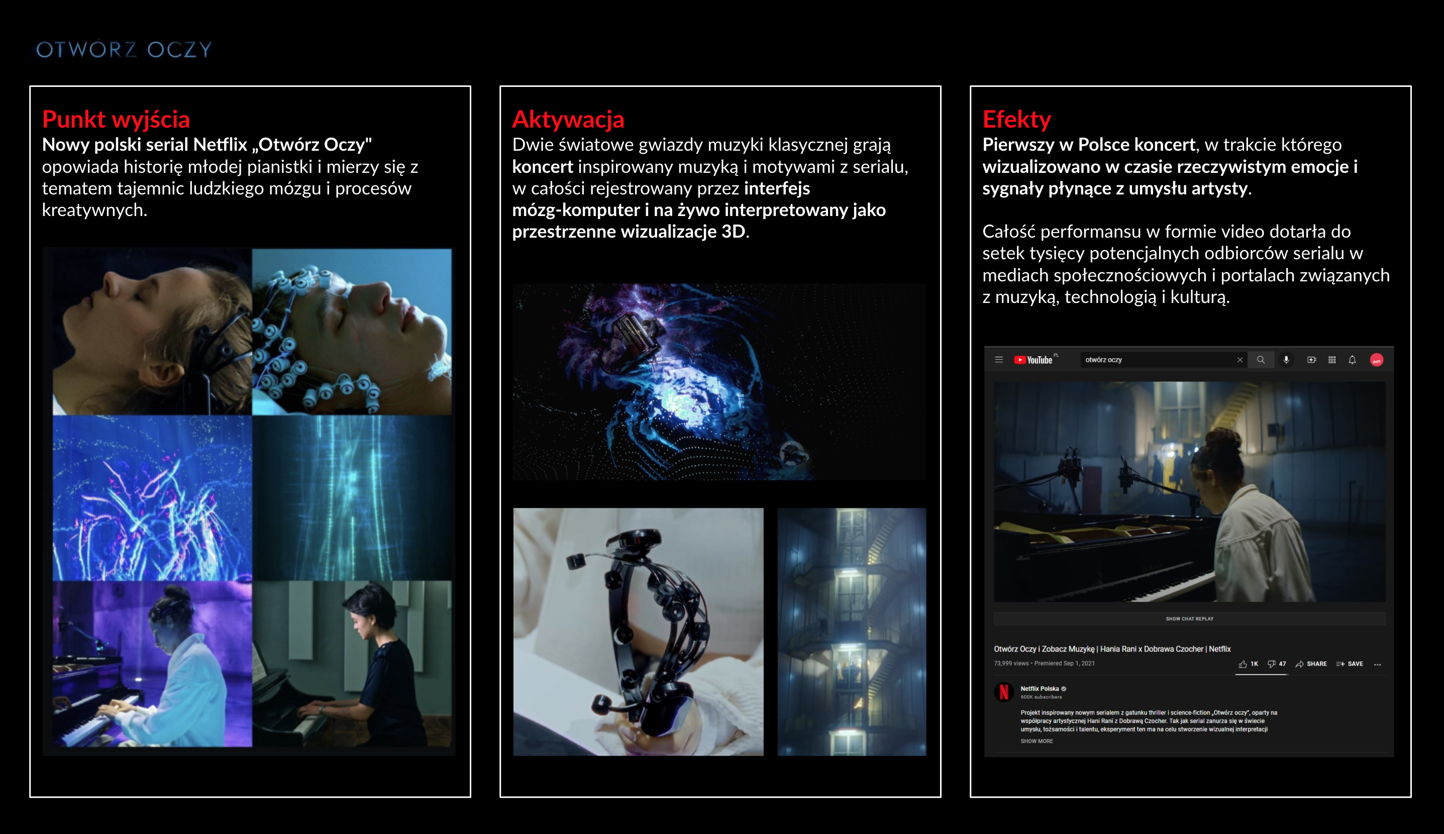 Dwie wybitne artystki współczesnej muzyki klasycznej, setki tysięcy sygnałów interpretowanych w czasie rzeczywistym przez interfejs mózg-komputer i wizualizacje 3D tworzą eksperyment, koncert i video-performance inspirowany serialem Netflix „Otwórz Oczy".