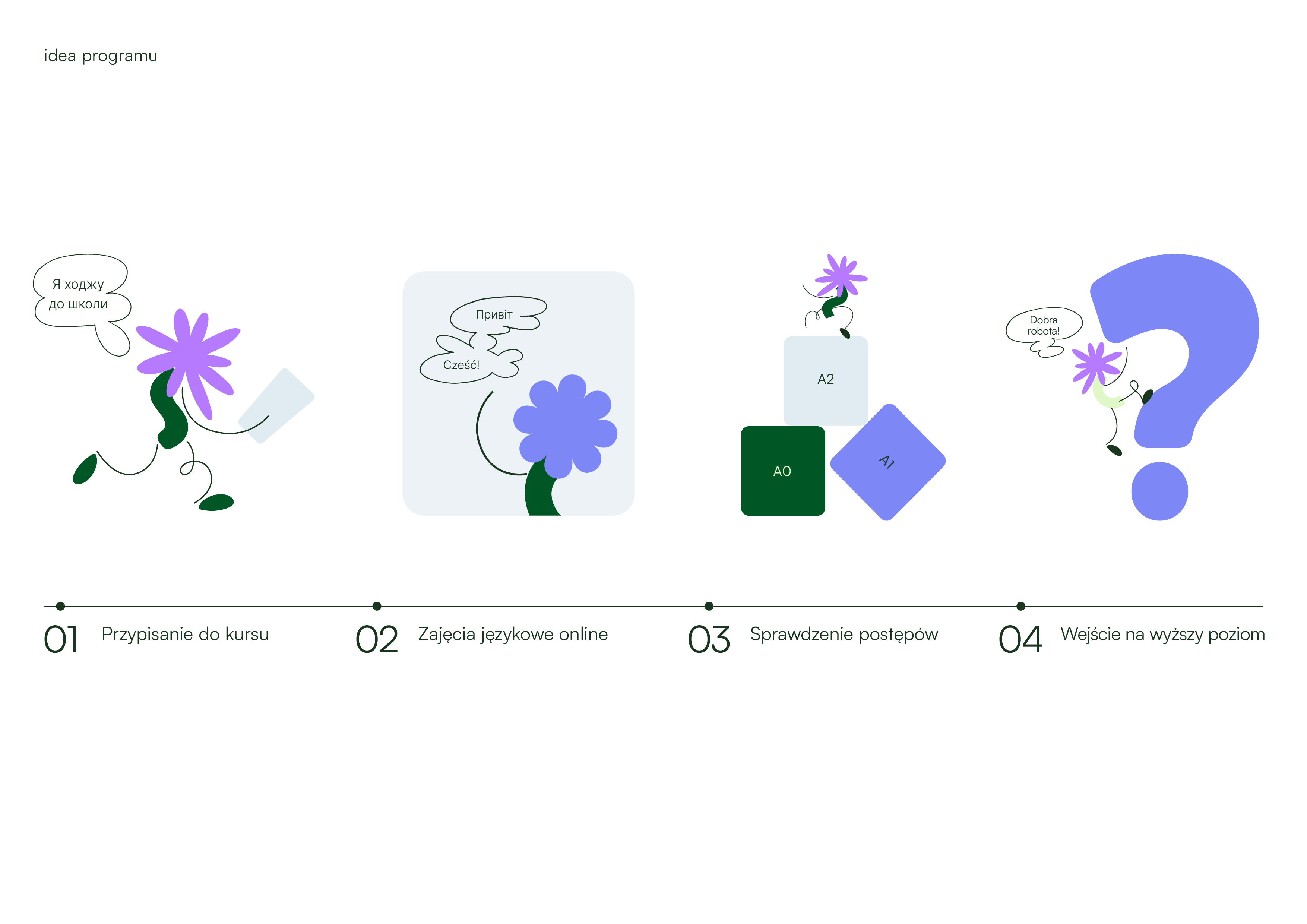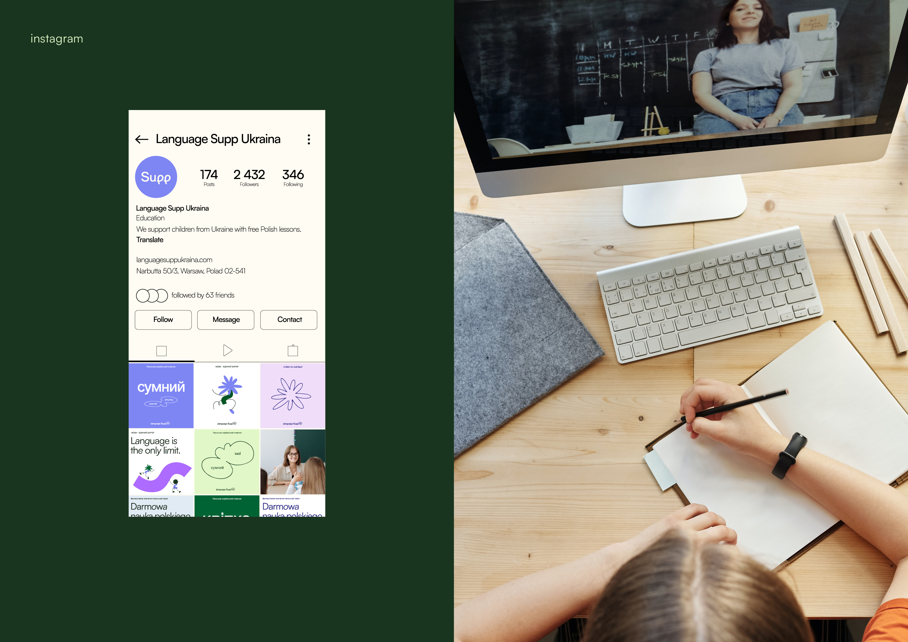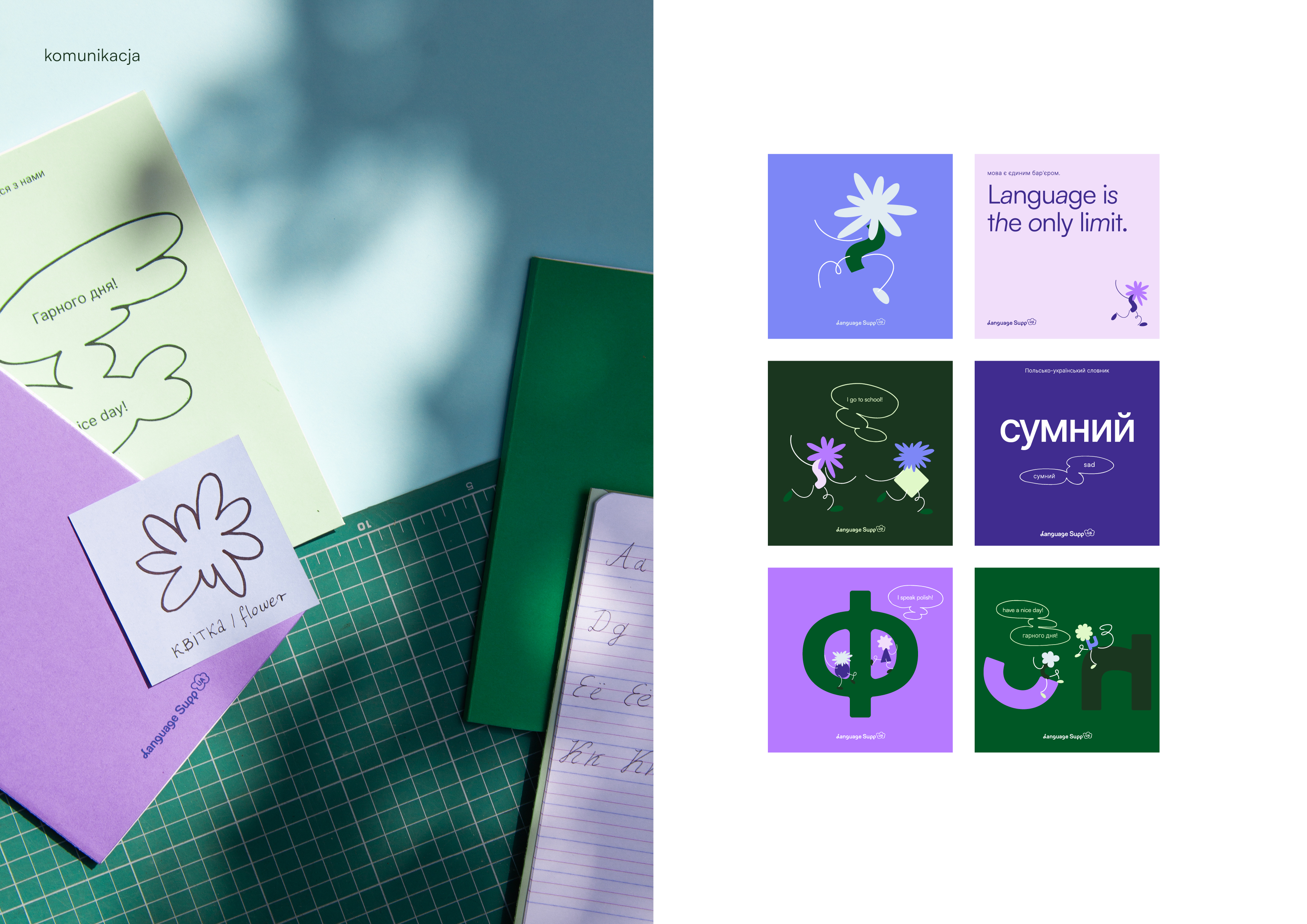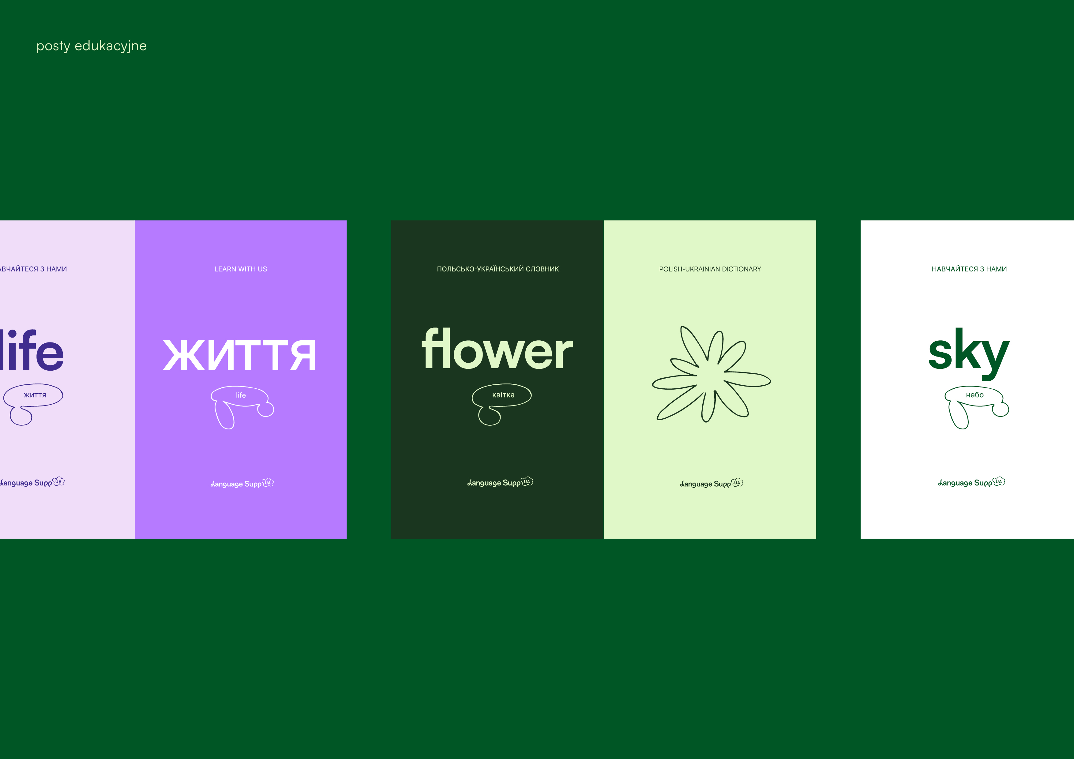 Language Supp Ukraina to inicjatywa darmowych lekcji językowych online, wspierająca dzieci z rodzin uchodźczych z Ukrainy. Efektem realizacji jest projekt wyrazistej identyfikacji wizualnej balansującej na granicy dziecięcego, przyjaznego charakteru, ale też dającej poczucie przynależności, przytulności i obietnicę profesjonalnej opieki/wsparcia.